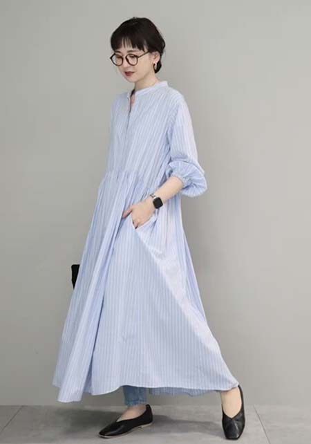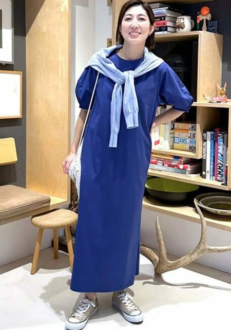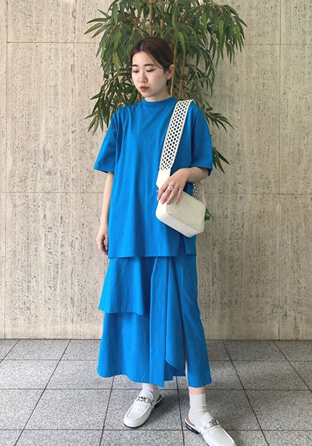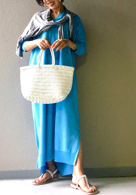 おしゃれな立ち姿を叶えてくれるブルーのワンピ。ゆったりとしたボリューム感は大人のわがままボディにぴったりなだけでなく、大人の余裕を感じさせてくれる大事な要素。大ぶりピアスで今っぽさをプラスして。