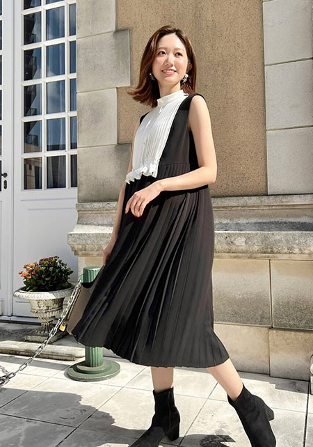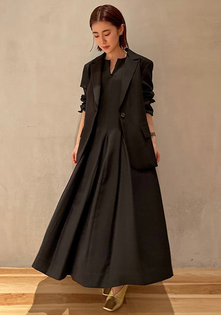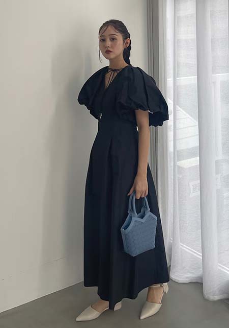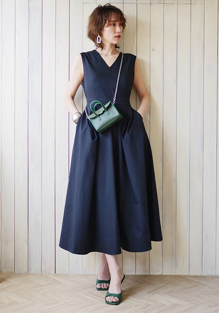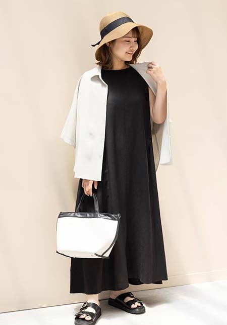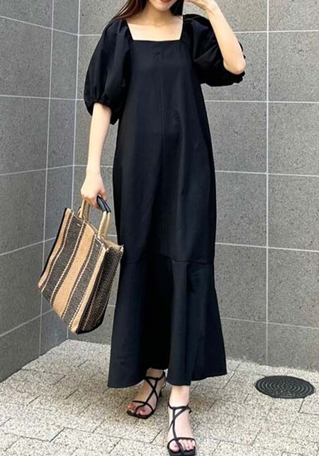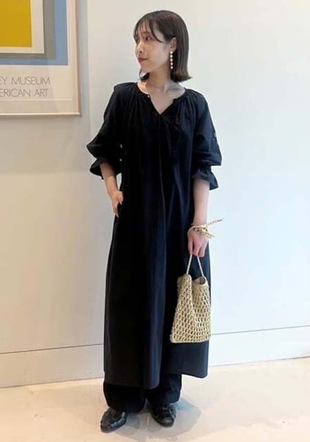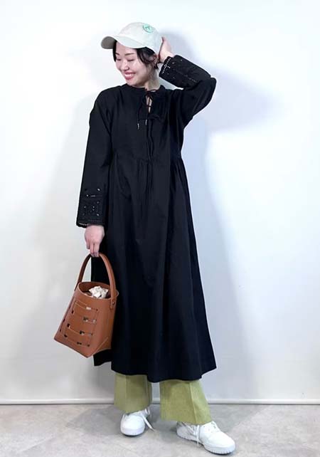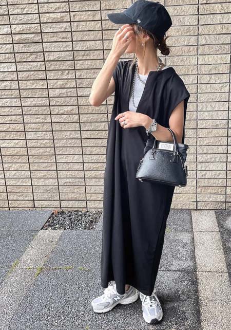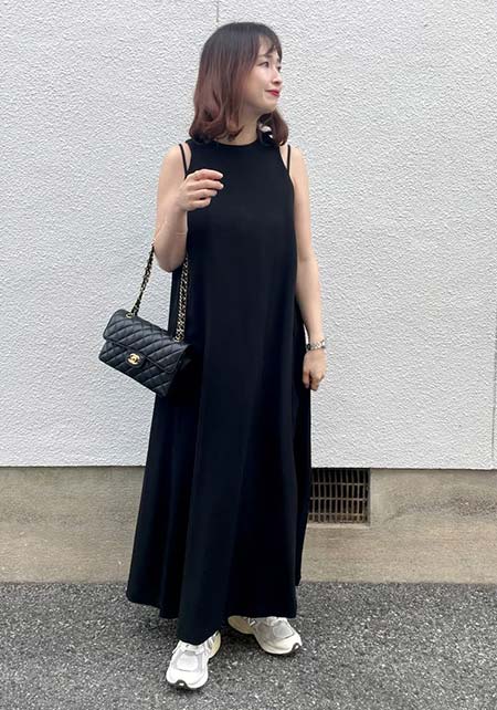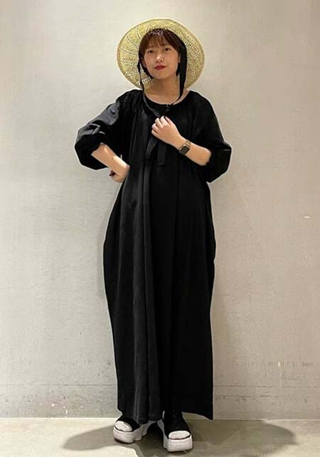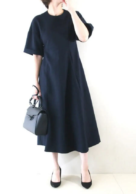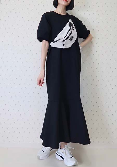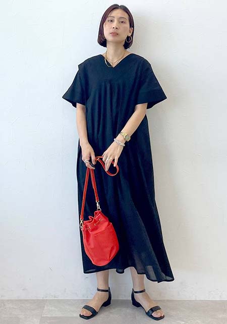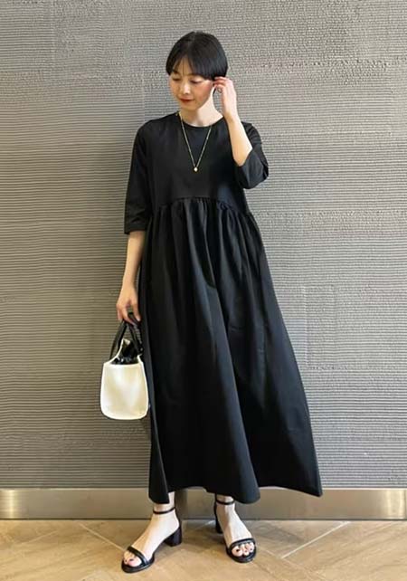 何かと使えるけれど、普通すぎると地味な黒ワンピ。シルエットにワンポイントデザインのあるものがおすすめです。長さはカジュアル見えするミディ丈をセレクトして。