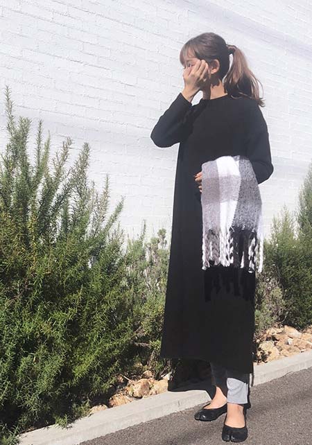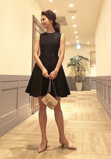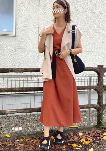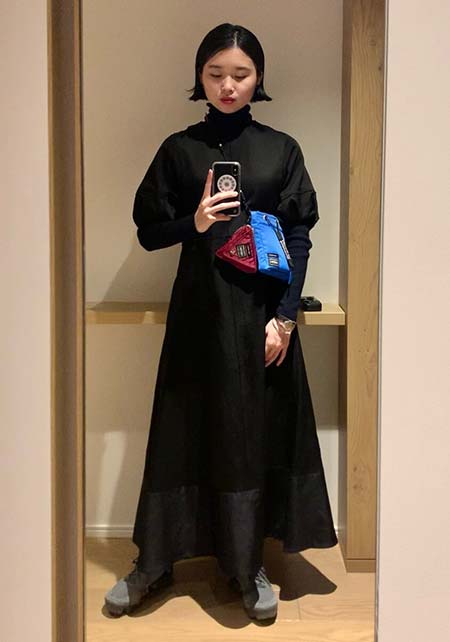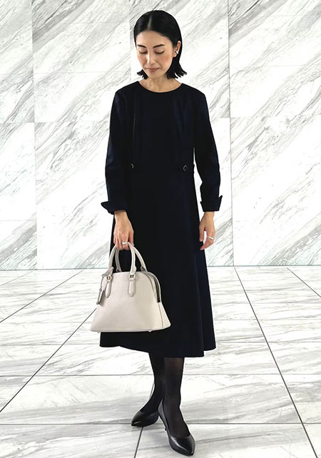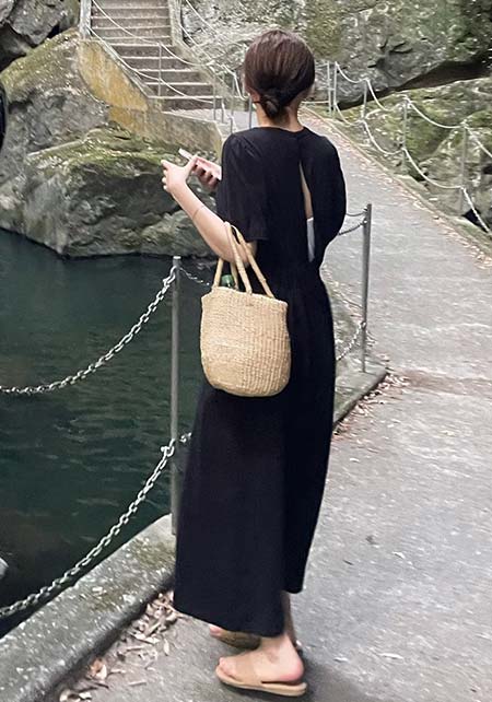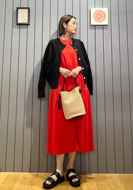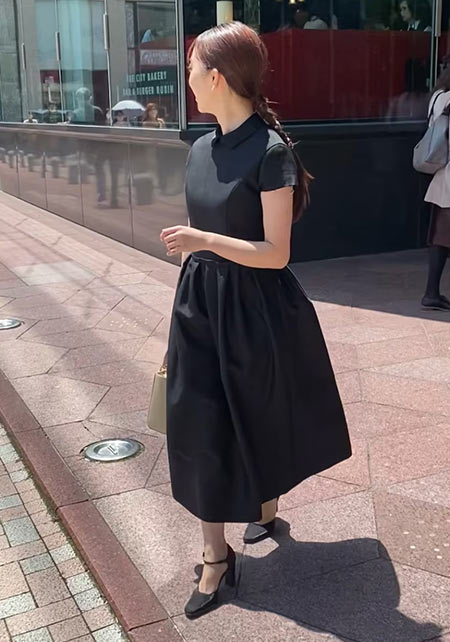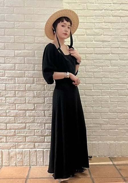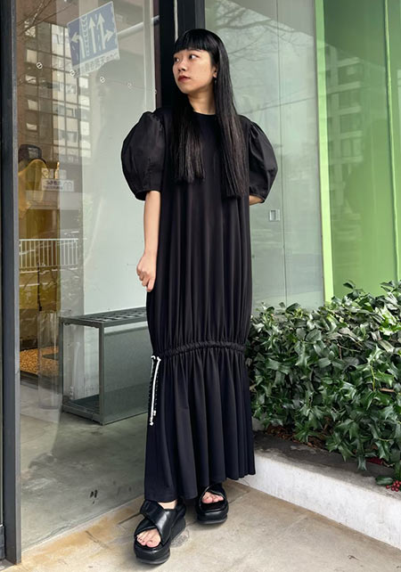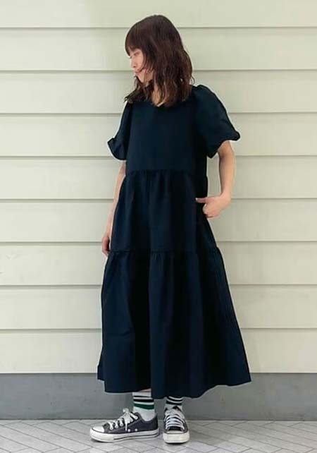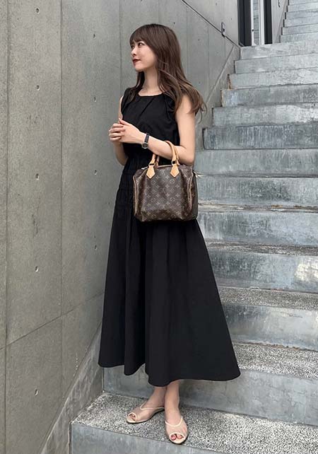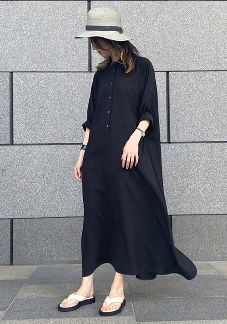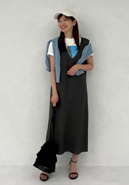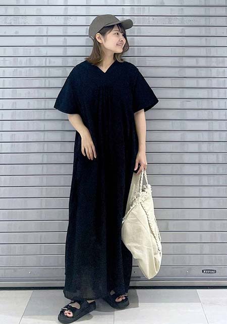 何かと使えるけれど、普通すぎると地味な黒ワンピ。シルエットにワンポイントデザインのあるものがおすすめです。長さはカジュアル見えするミディ丈をセレクトして。