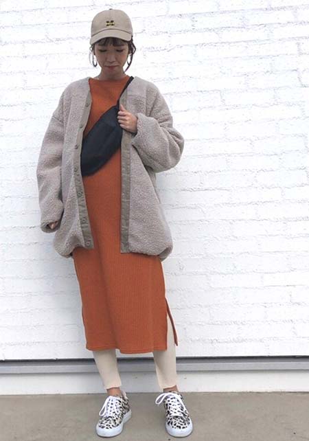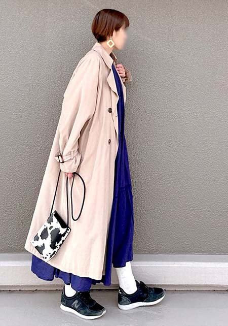 アウトドア調のアウターをケープみたいに無造作に羽織る、ひねりを効かせたスタイリングでワンピに奥行きを。