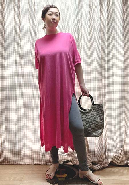 体型を隠すストンとしたシルエット。斜めにカットされたアシンメトリーな裾は膝の位置もごまかしてくれます。