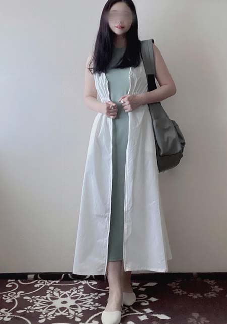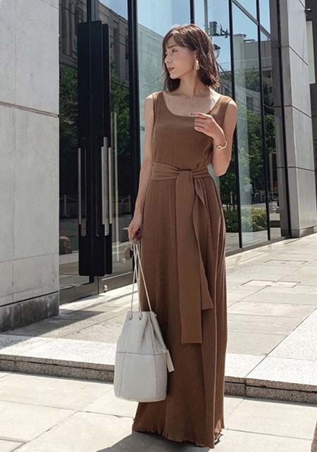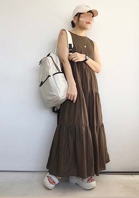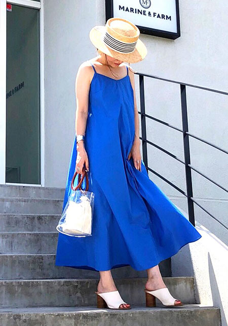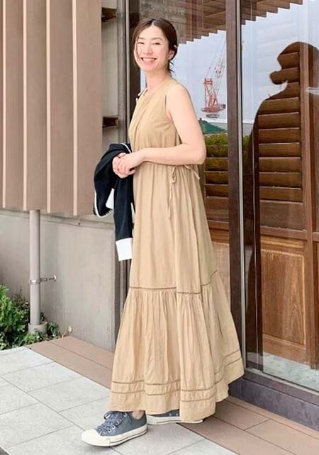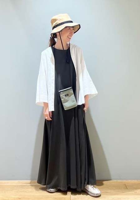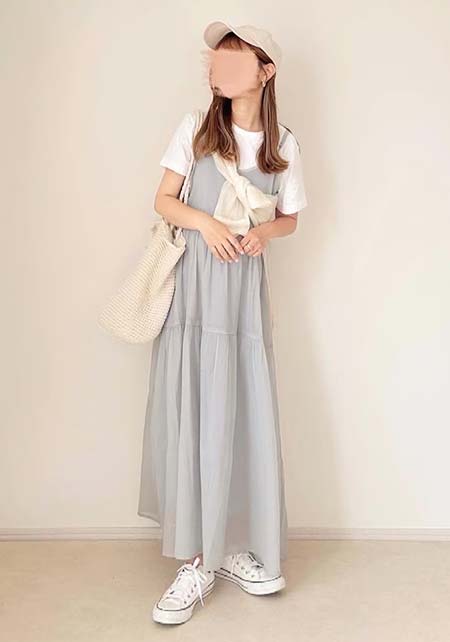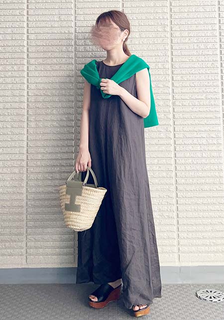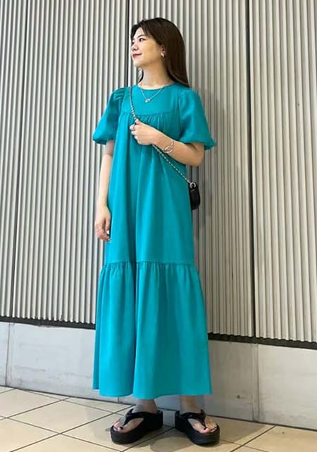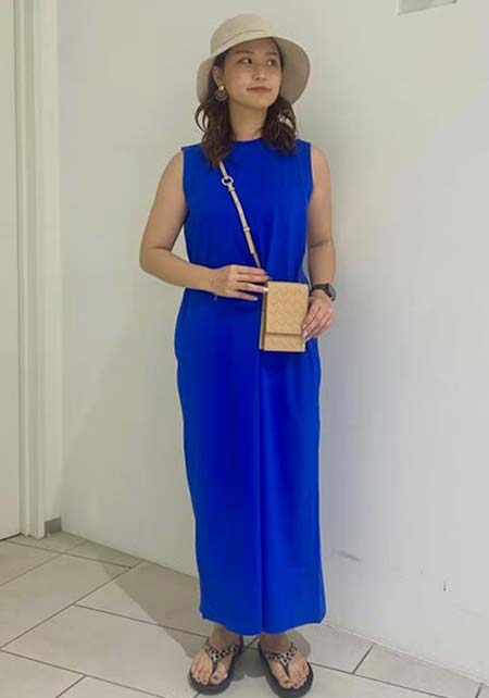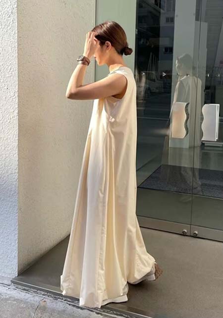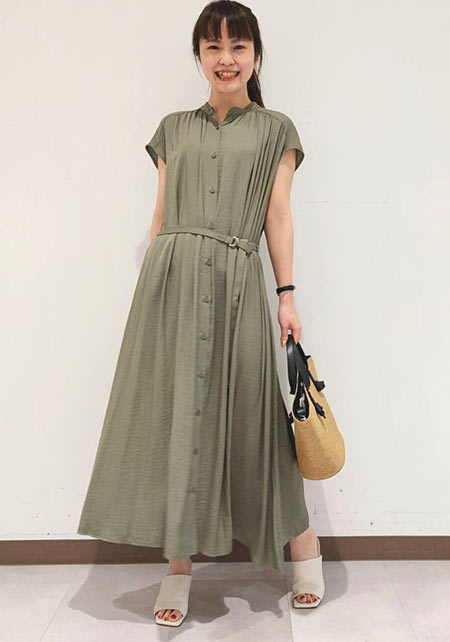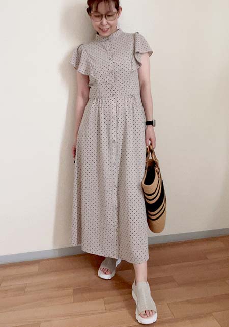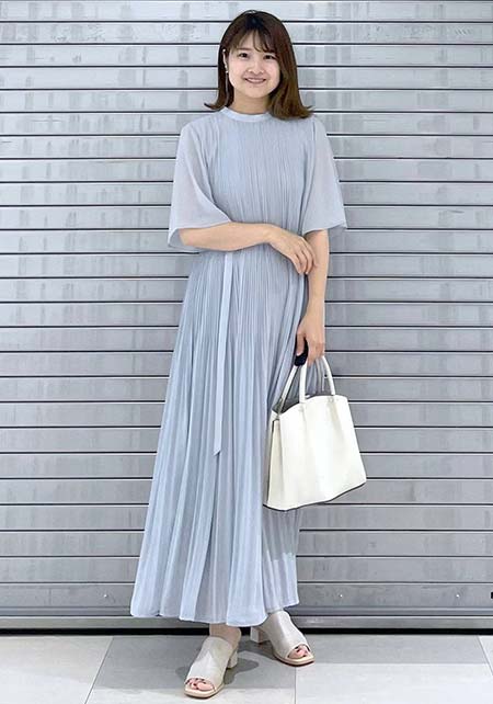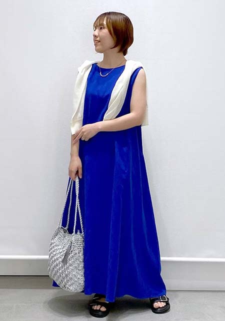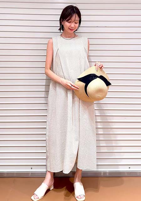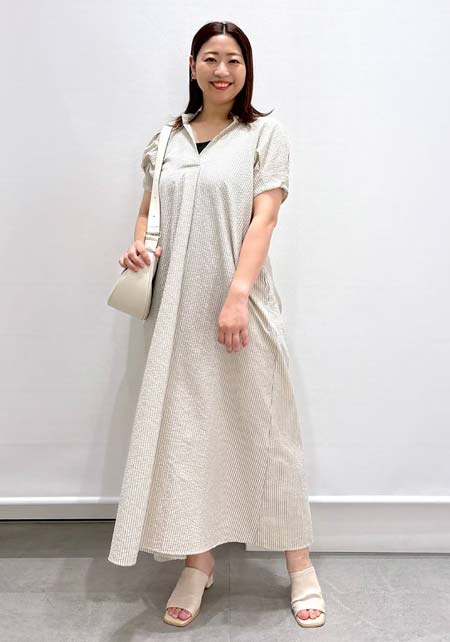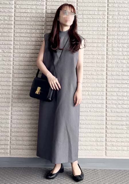 “着られている感”が出ないよう注意したいマキシ丈ワンピ、Sサイズでも素敵に見えるポイントは、ちょうどいいくるぶし丈と、ウエスト位置がマークされたものを選ぶこと!