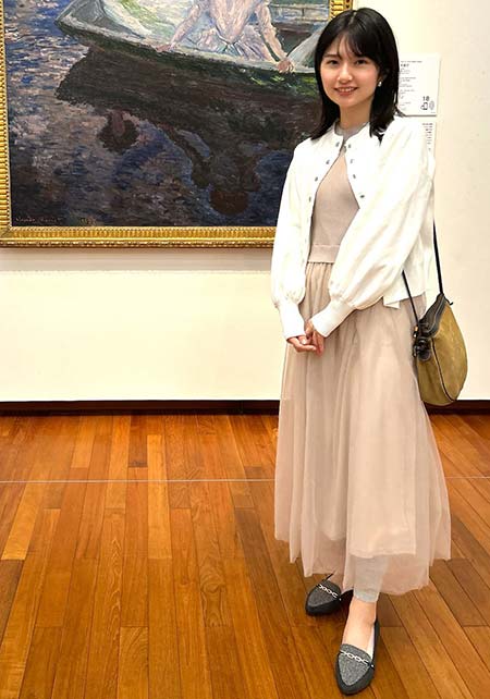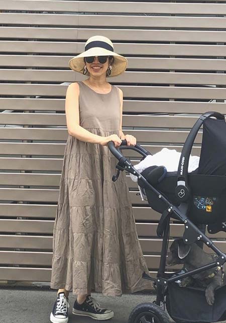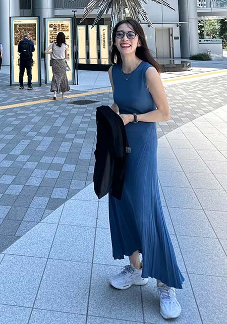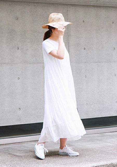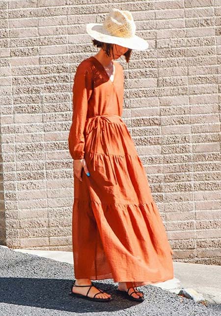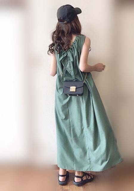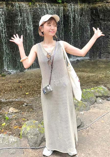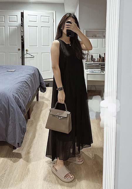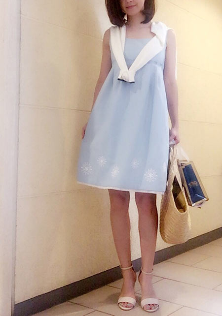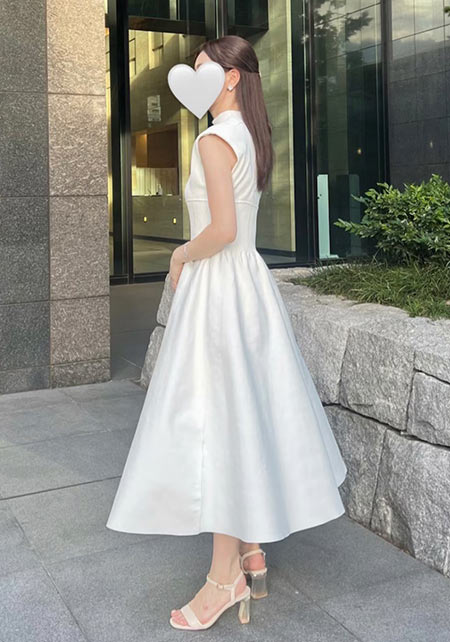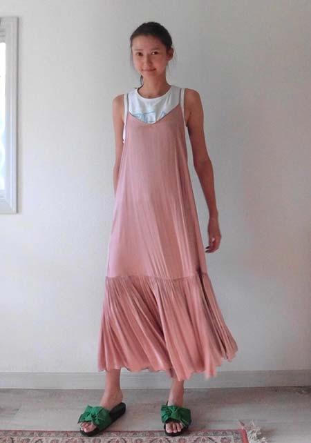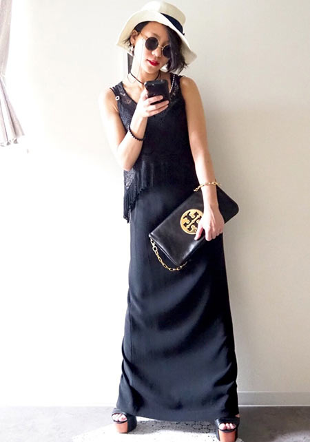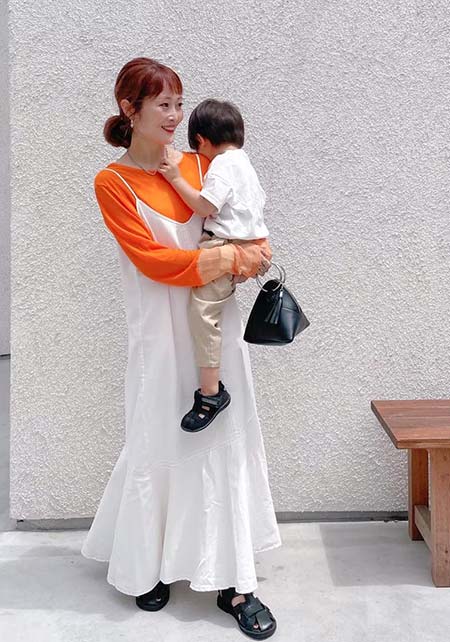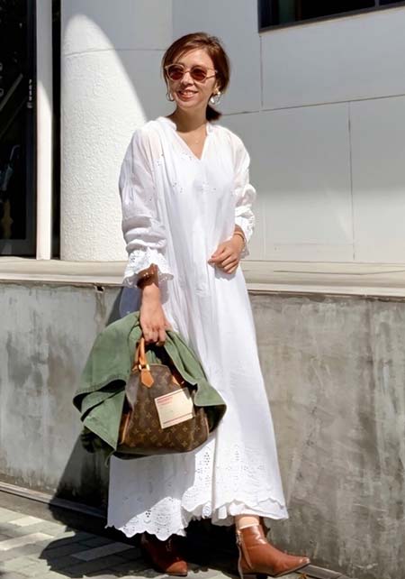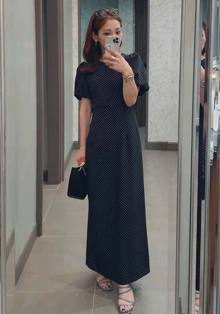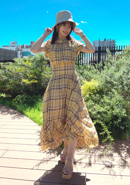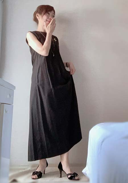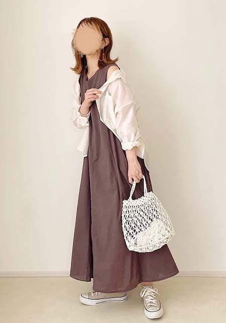 “着られている感”が出ないよう注意したいマキシ丈ワンピ、Sサイズでも素敵に見えるポイントは、ちょうどいいくるぶし丈と、ウエスト位置がマークされたものを選ぶこと!
