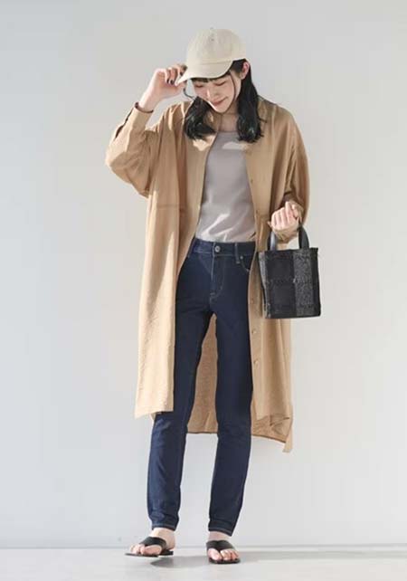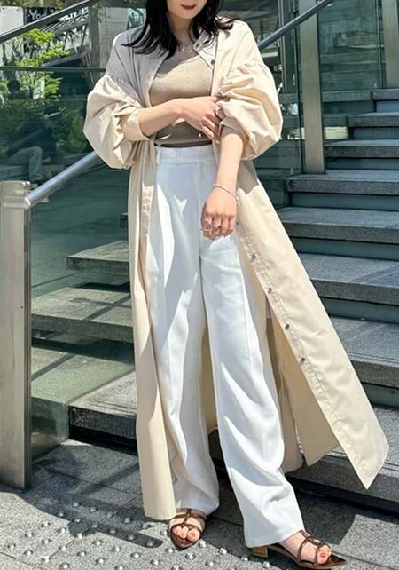 カットソーとパンツのベーシックな着こなしに、ライトコート気分でON。