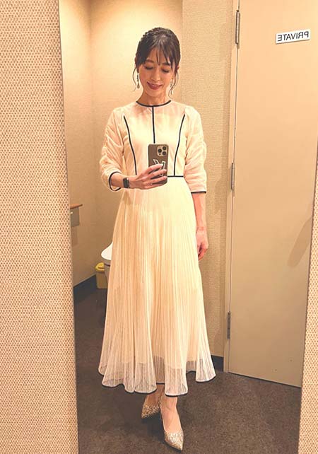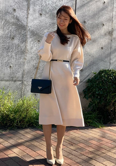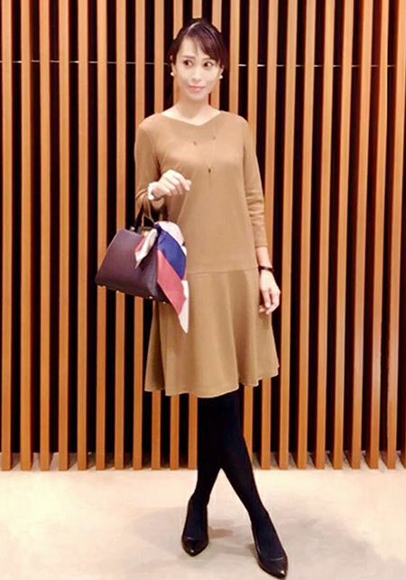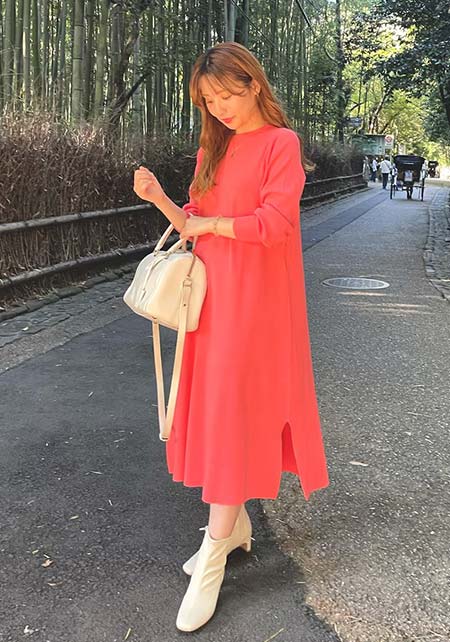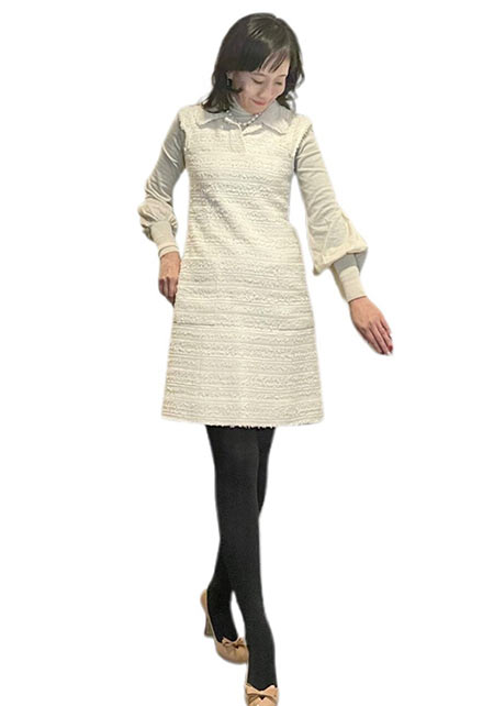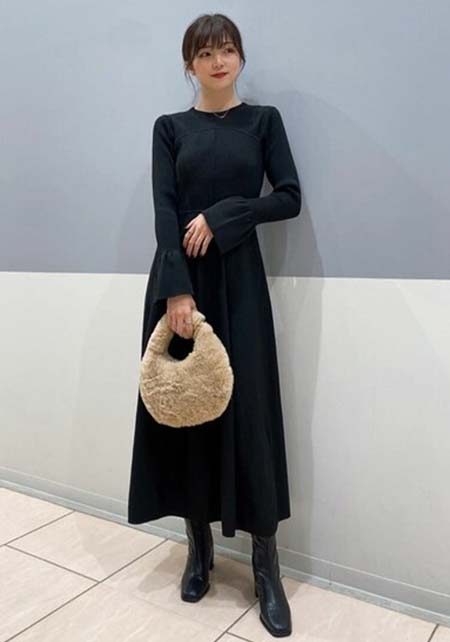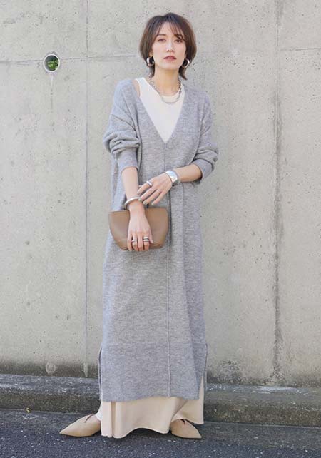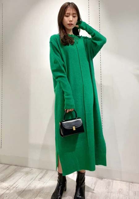 知性が漂うエレガントなワンピは定番的。こちらは程よいフィット感と落ち感で、エレガントな女らしさと知性が漂うニットワンピース。