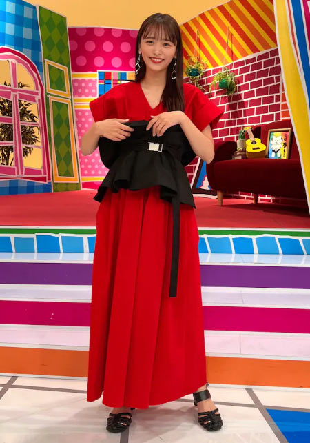 肩が開いたデザインやウエストのバックルなど、ポイントになる箇所が上半身にあるからスタイルアップが叶う一着。