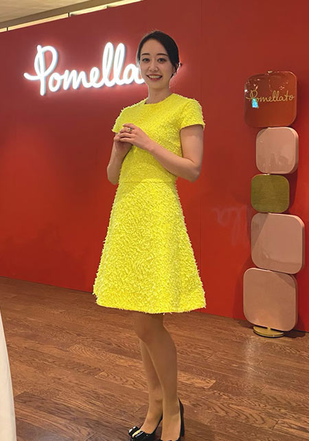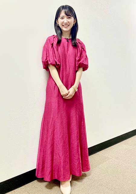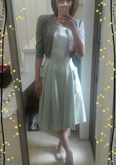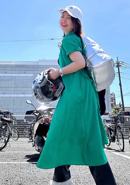贅沢に布を使いフレアがキレイに出る分、普段より丈が短めに作られた一枚。小柄さんにもフィット! 体型に合っていればこんな派手色もすっきり美しく見られます。