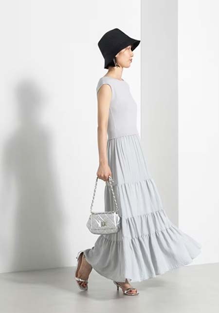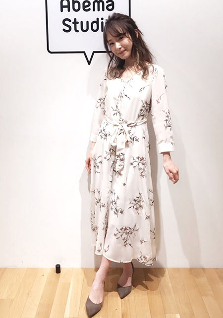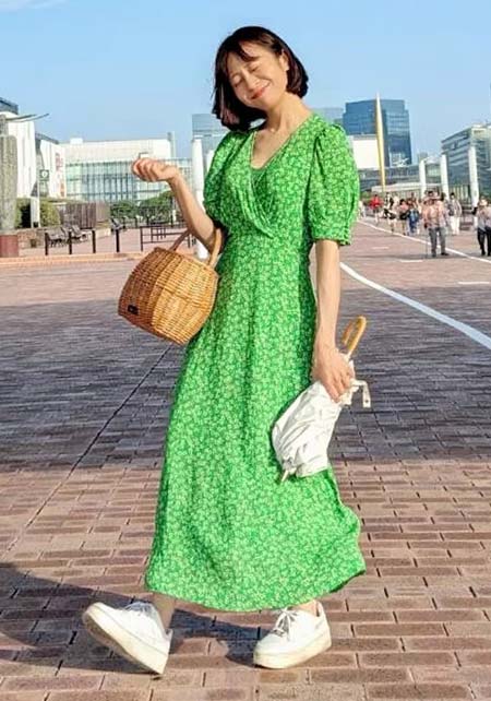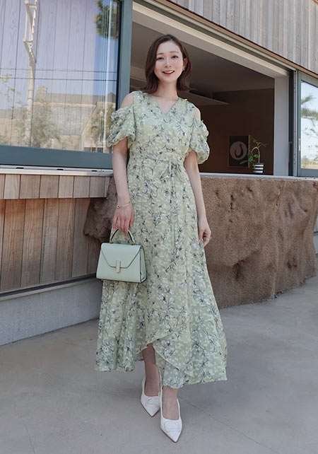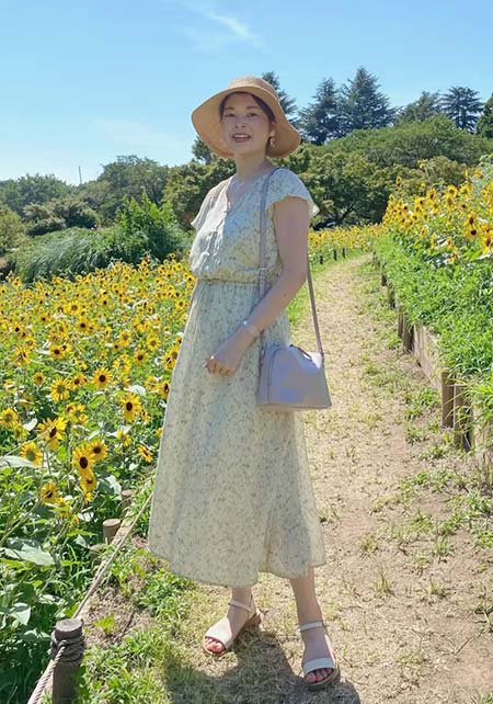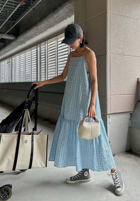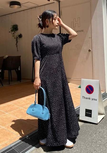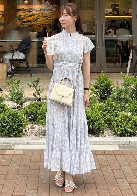幼く見えないシックな配色と、花柄の着こなしが古く見えないようマキシ丈を選んで。花の色とリンクさせたブルーの小物で統一するとさらに今年らしいムードにシフト。