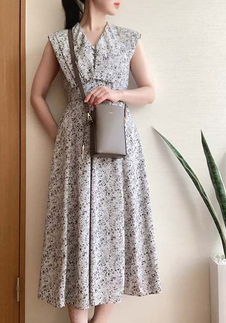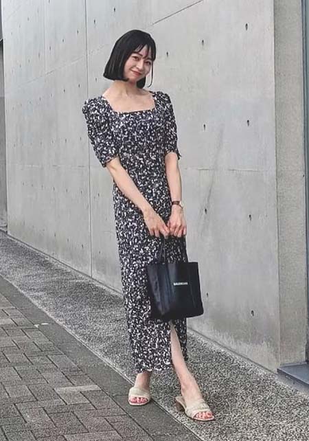 花柄ワンピはそれ自体が甘くフェミニンな存在。その甘さを程よくマイルドに落とし込んでくれるのが、一見花柄かと疑ってしまう“モザイクのような花柄”。ダークな色になじませたり、余白なく密集した曖昧な花柄が大人の甘さをトーンダウンさせる。