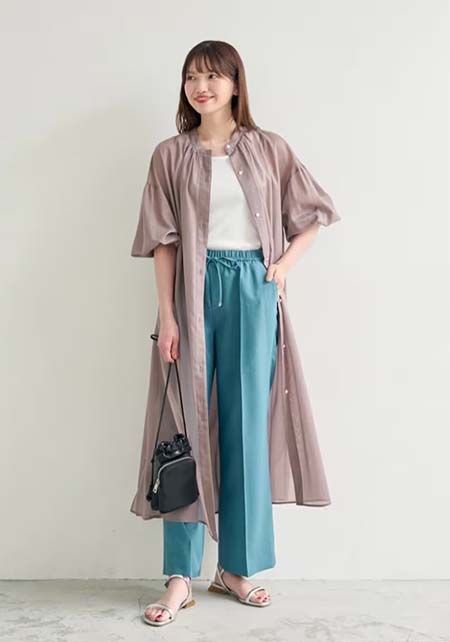 ワンピ見えするセットアップもシャツ型なら、きちんと感が必要なシーンにも対応でき万能。シワになりにくい素材だから座り仕事の多い日も楽チン。接触冷感・シワになりにくい・自宅洗濯OKと、高機能さも嬉しい。