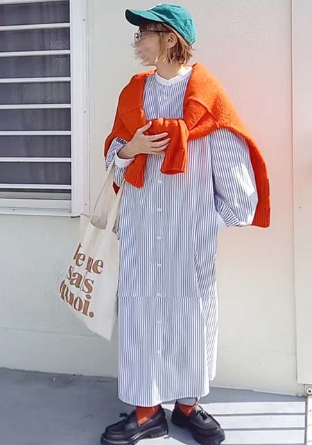 グレー×黒のチェック柄にオレンジ、ブルーのラインをアクセントに効かせた脱シンプルな一枚。プレッピーなムードを漂わせるワンピースには、白の小物でカジュアルアップ。