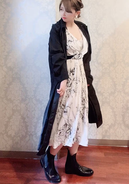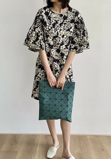 すっと肌になじむとろみ素材のブラックワンピースは線画のような花柄でぐっとクラシカルな雰囲気。黒で統一したボディバッグの斜めがけや厚底のハイテクスニーカーでスポーティにカジュアルダウンするのが気分。