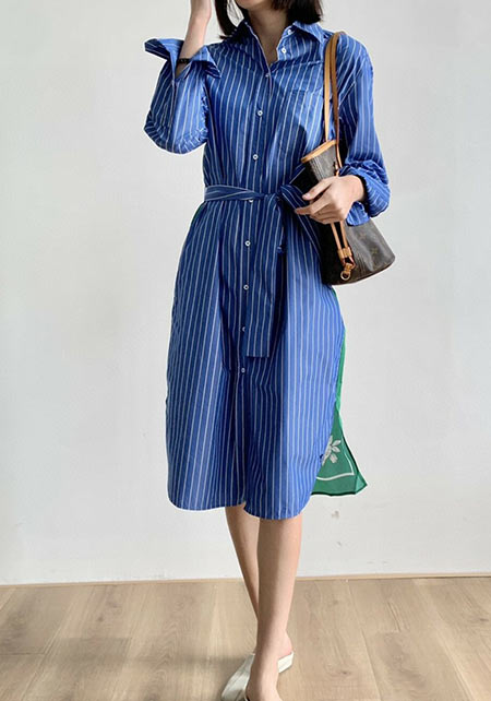 襟元は端正、シルエットはビッグ&ワイドとギャップのあるデザインで、さらりと纏うだけでモダンかつクールに決まるシャツワンピース。キャメル地にブラウンの細ストライプで秋らしく。