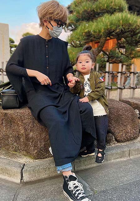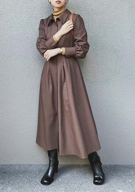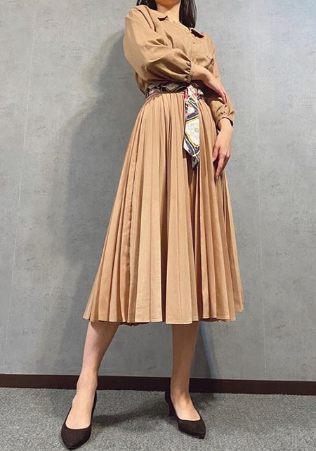 共素材の小さな衿が醸し出す、絶妙なきちんと感も好ましい。ひざをしっかり覆う長めのレングスで、大人世代のさまざまなシーンに対応してくれます。
