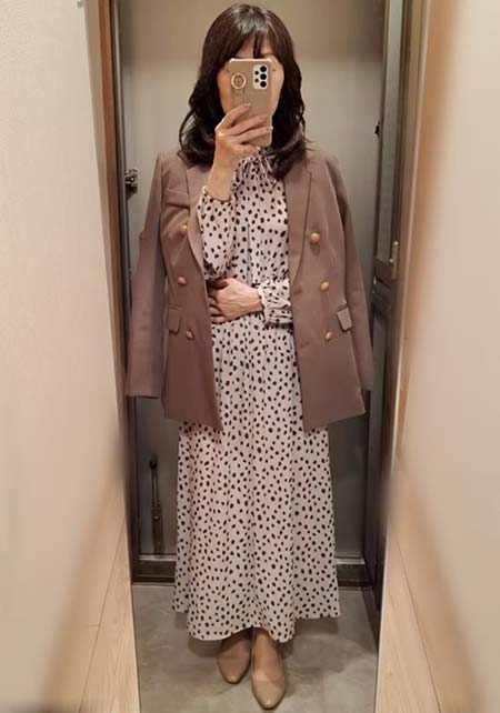 遠めだと無地に見えるくらいさりげなく柄をなじませたワンピースなら、インパクトも控えめで着やすい。ブラウンベースなら品よく優しげになる。