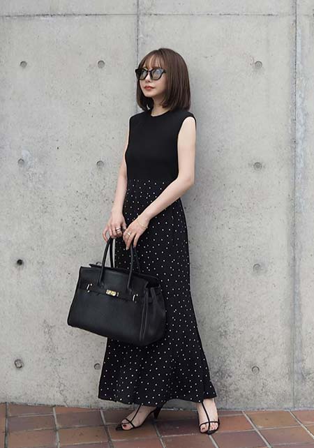 ブラックやネイビーをはじめ、ダークトーンの地色を選べばドット独特の可愛さやレトロさを消し、大人でもしっくりときます。コットンではなく、落ち感のある素材で大人の品格も加えたい。