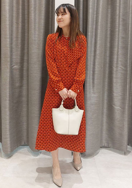 オリエンタルな花柄が明るさを抑えたオレンジ色とマッチ。するんと落ち感のある薄手の生地でもたつかず、スマートなシルエット。