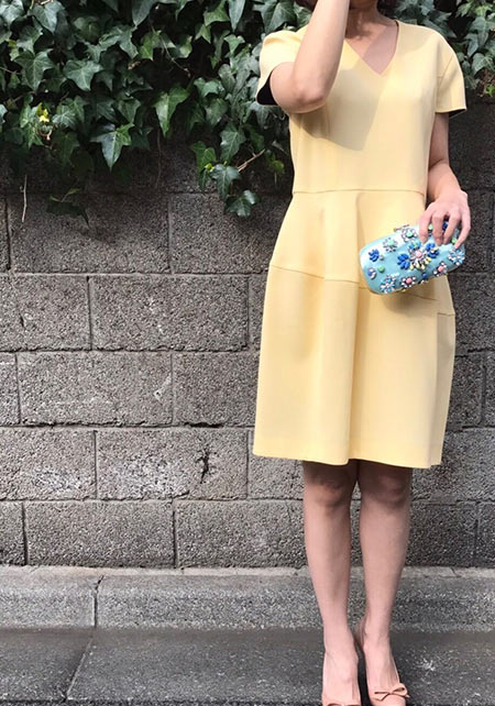 キレイめレストランにも通用する“きちんと感”ワンピはセルフォードの十八番。こちらはフィット&フレアとハイウエスト切り替えで、スタイルアップ効果のある一枚。
