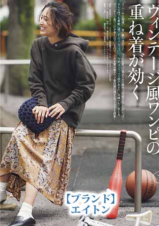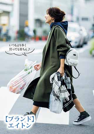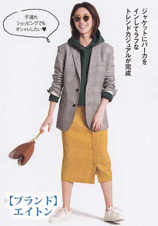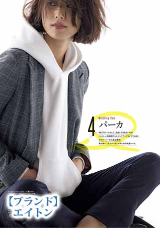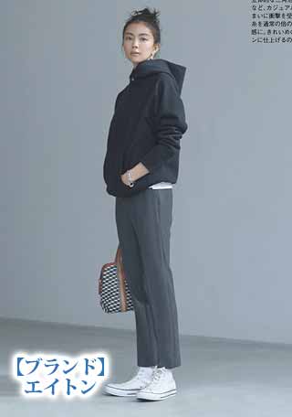 パーカーが有名で雑誌掲載(VERY、Oggi、CLASSYなど)多数! エイトンは、シンプルかつ程よいモード感が大人世代から支持されるドメスティックブランド。パーカーは、カジュアルなアイテムなのに凛とした佇まいになる! と、スタイリストやおしゃれ好きが愛用。