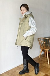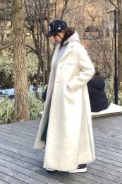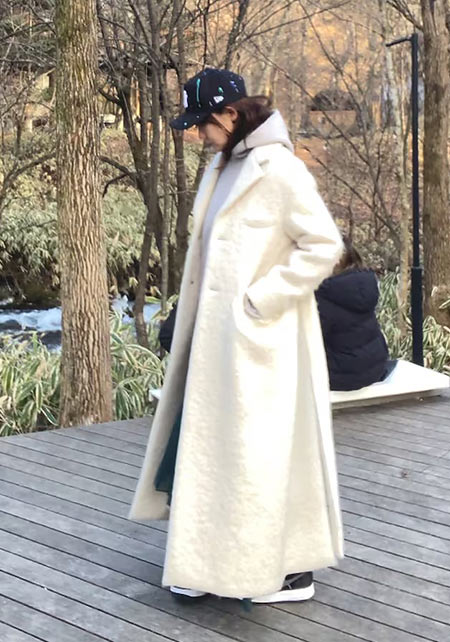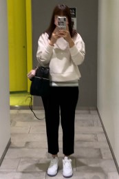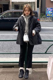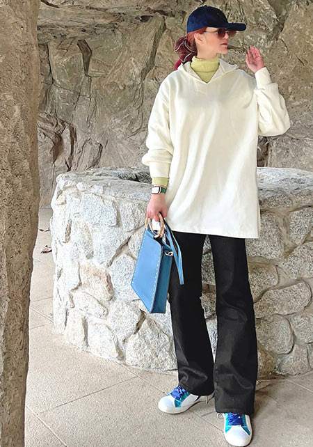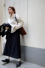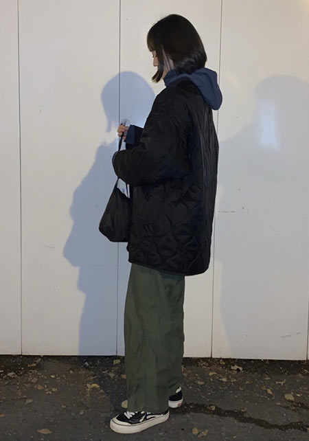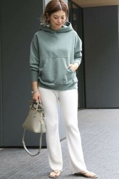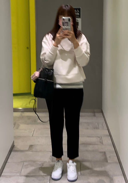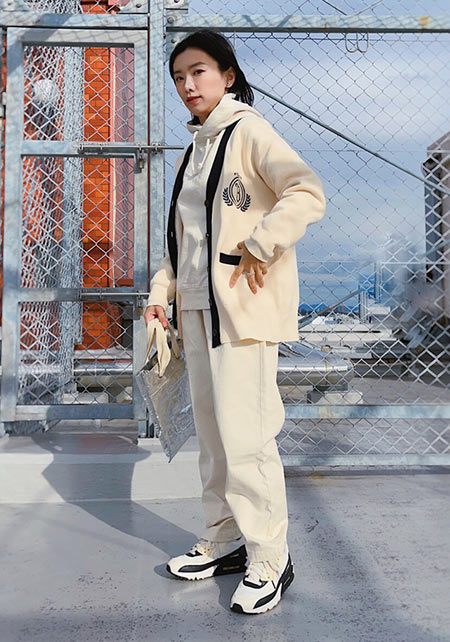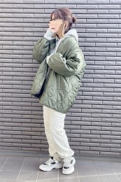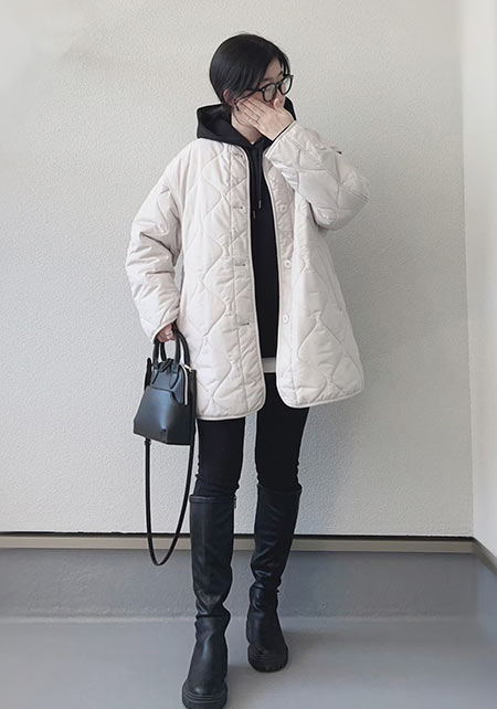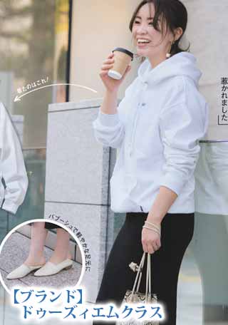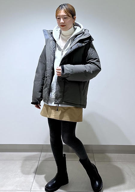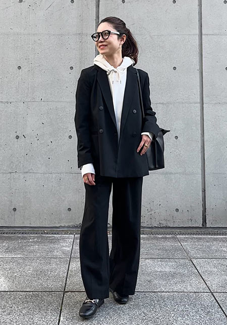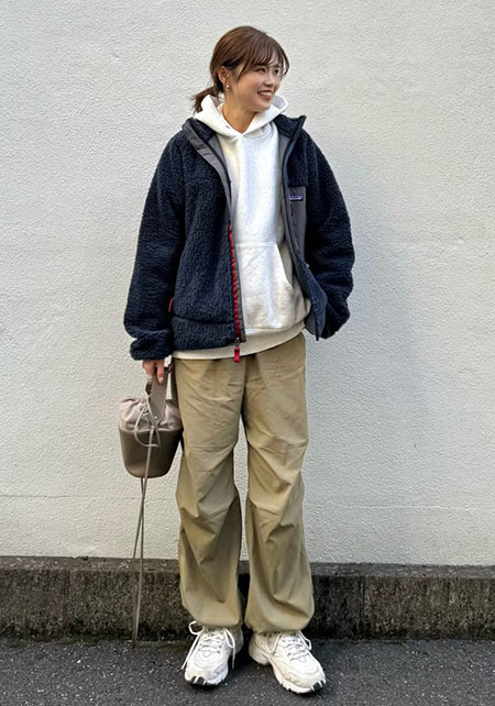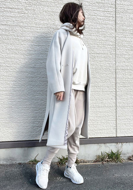 スポーティなフードの印象をハイネックを覗かせることで弱める。白が顔まわりを華やかに見せるのでカジュアルさが軽減されます。