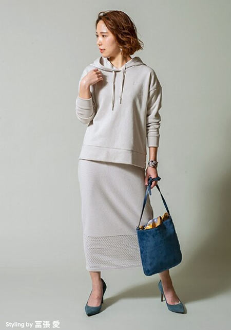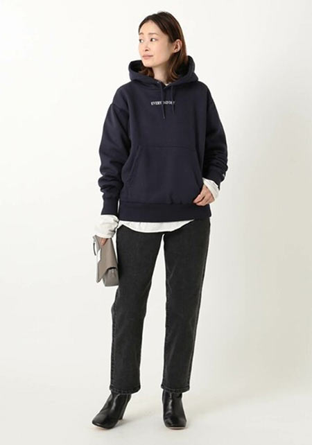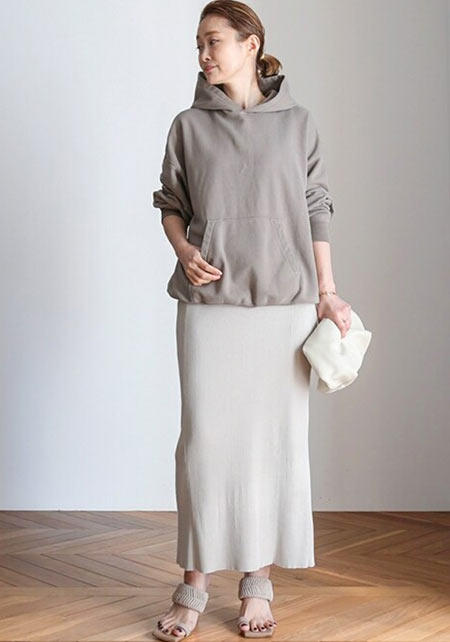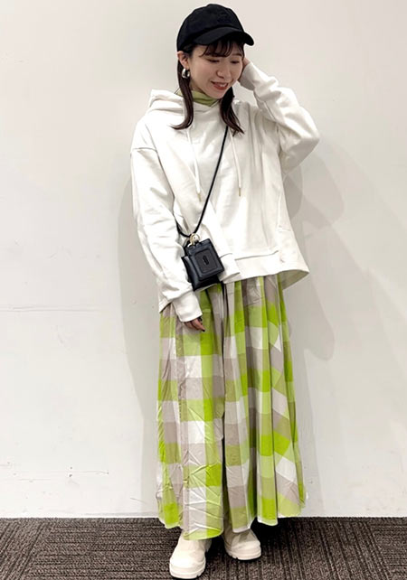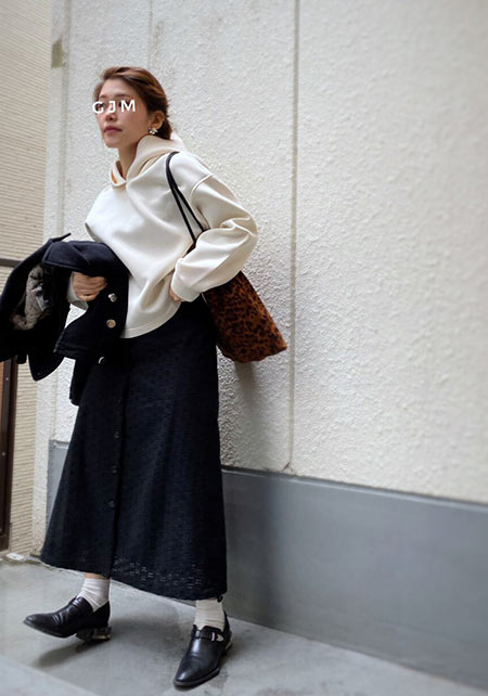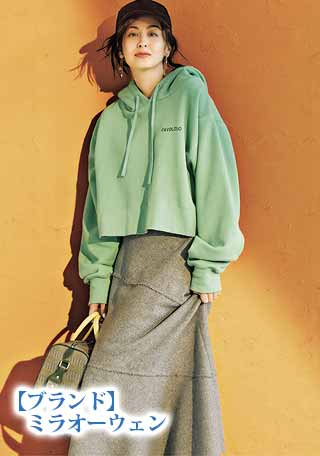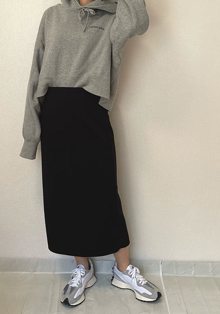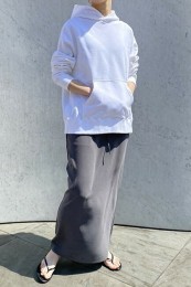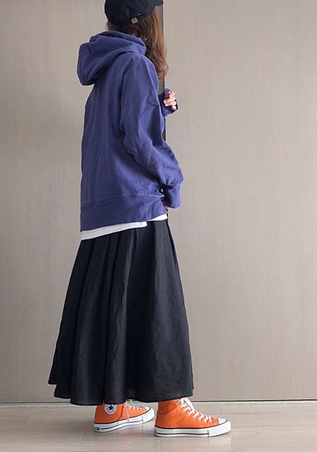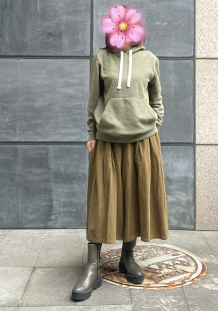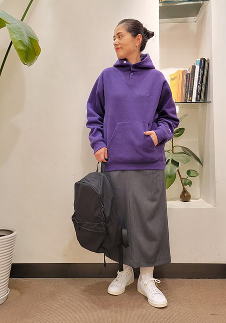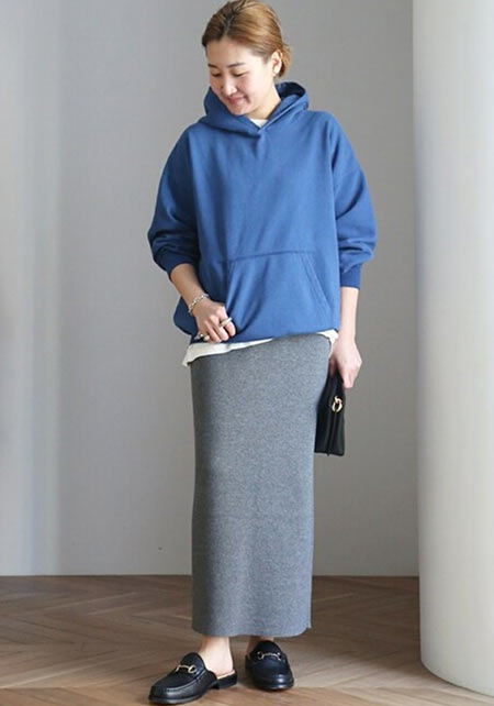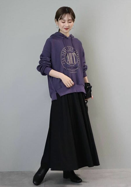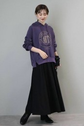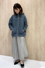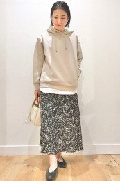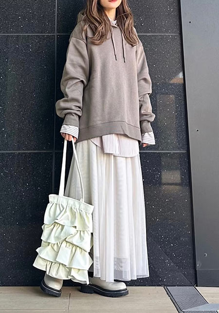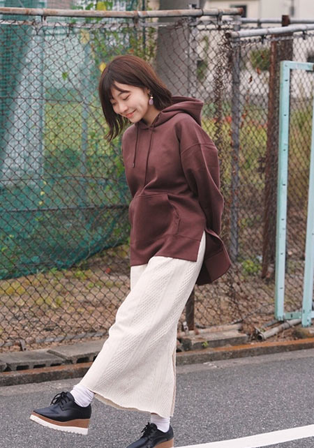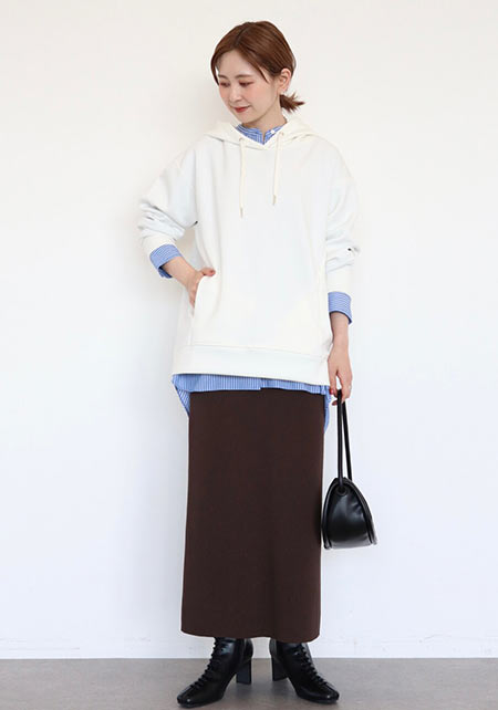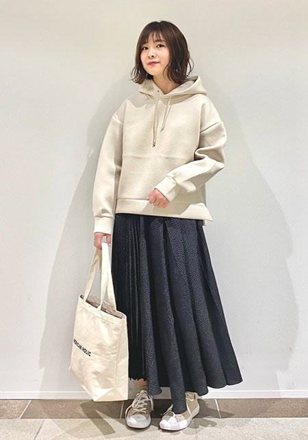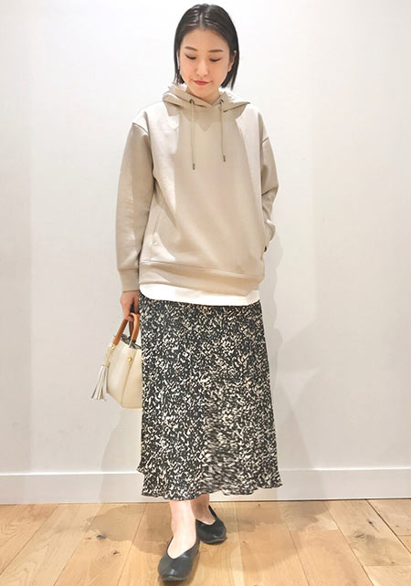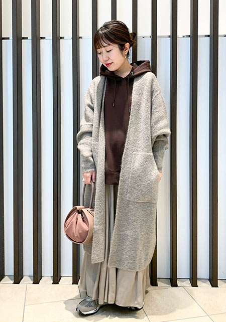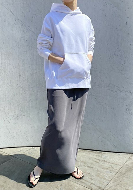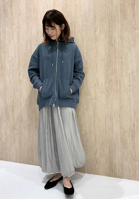 顔まわりのボリューム感が足され、目線が上がるフーディ。ロングスカート&ぺたんこ靴のときにバランスよく見せてくれるお役立ちアイテムです。