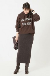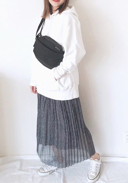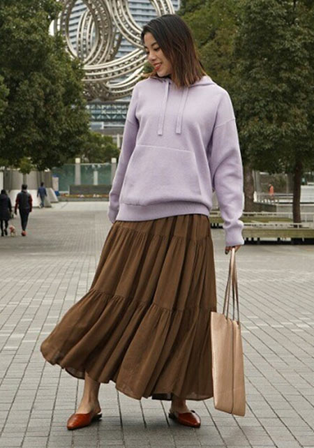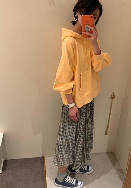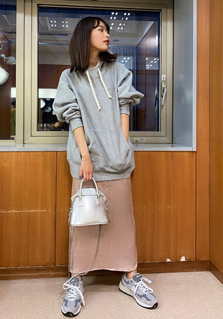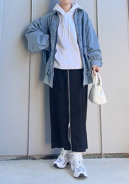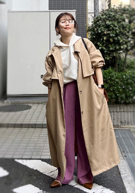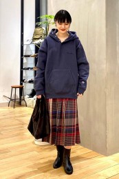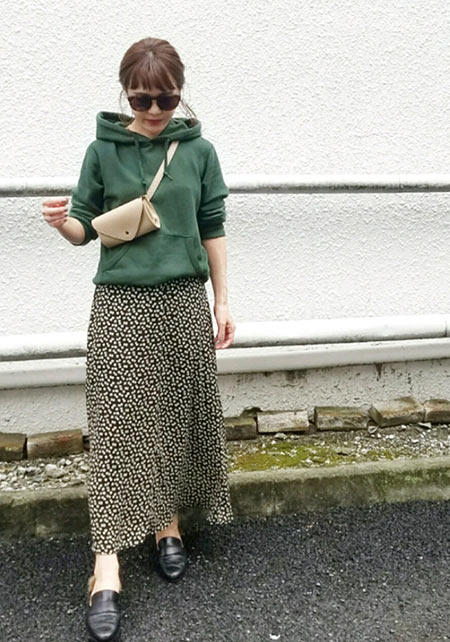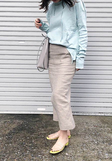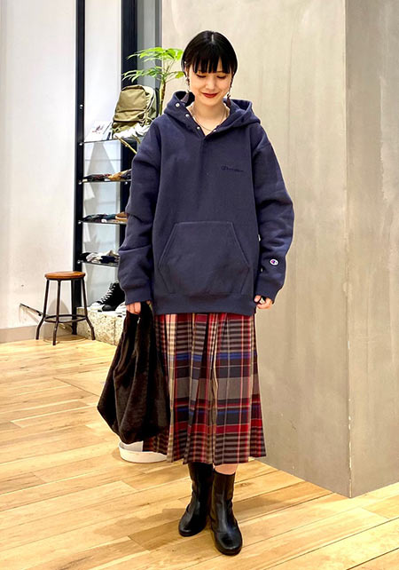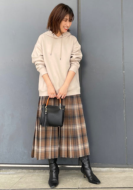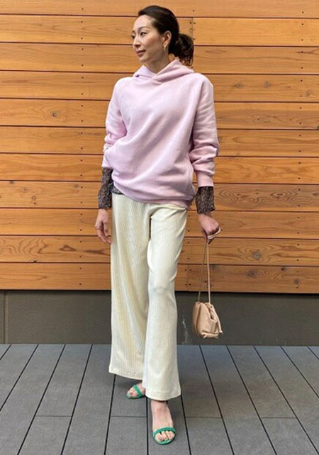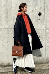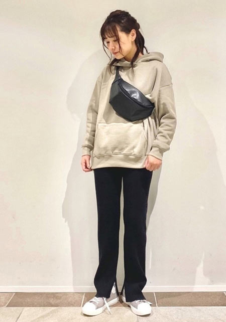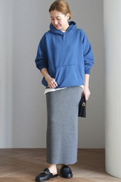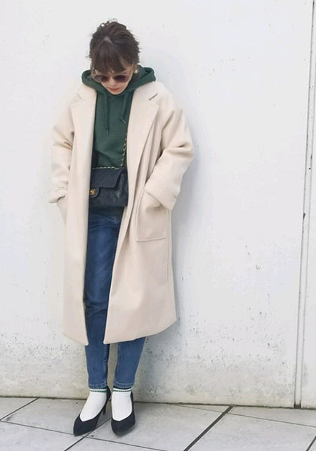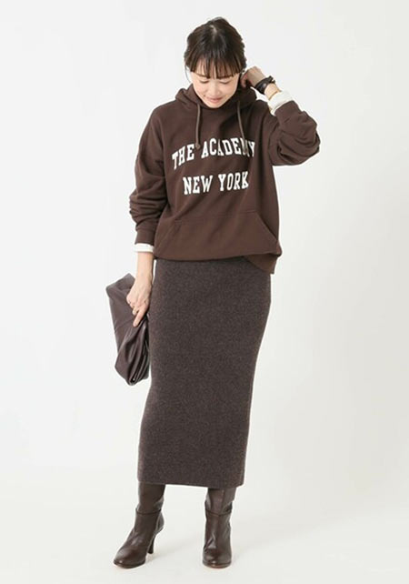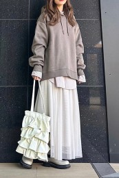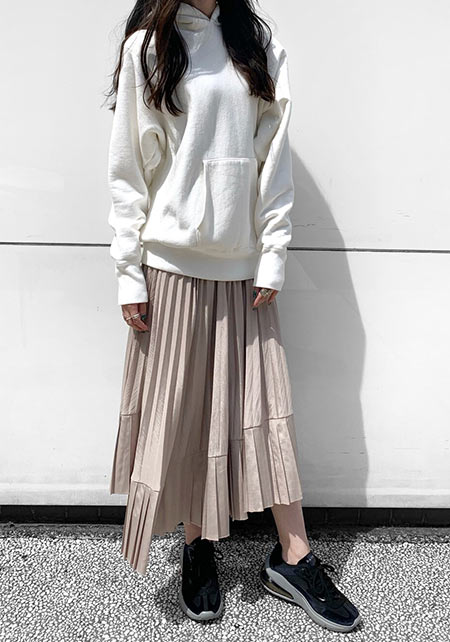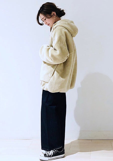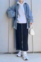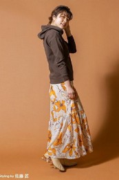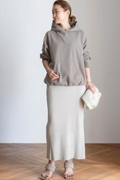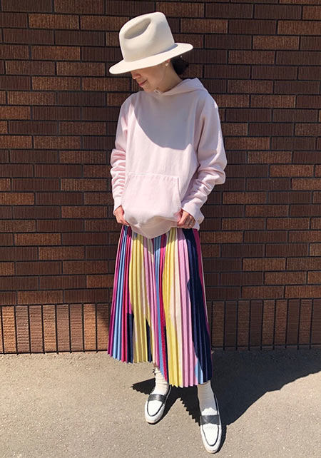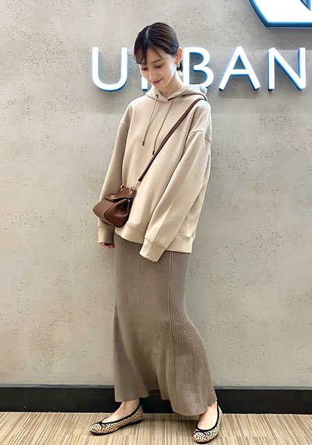 顔まわりのボリューム感が足され、目線が上がるフーディ。ロングスカート&ぺたんこ靴のときにバランスよく見せてくれるお役立ちアイテムです。