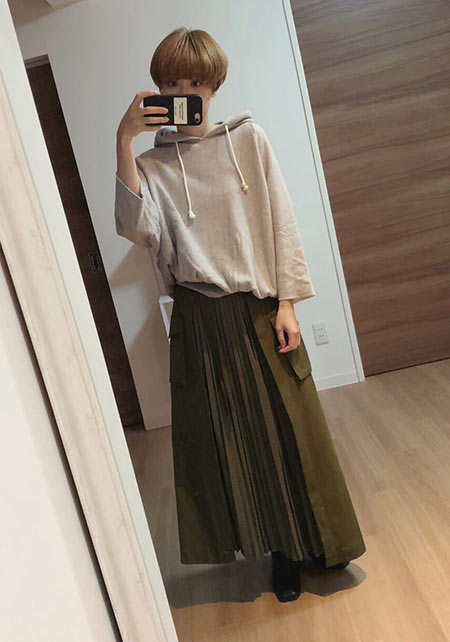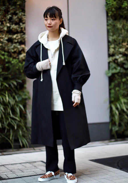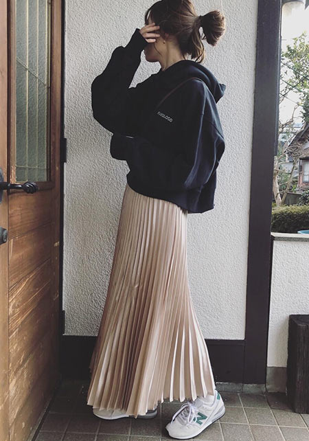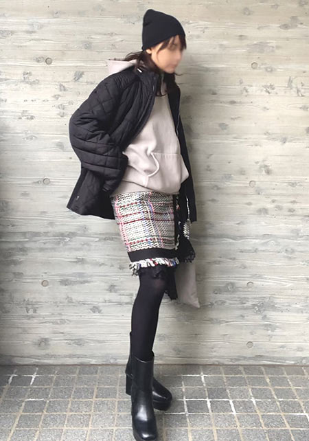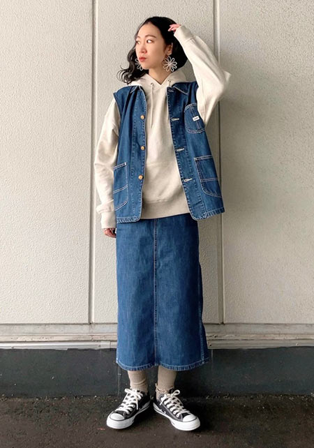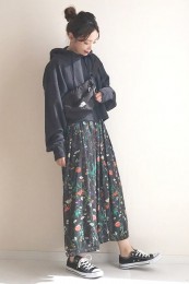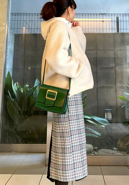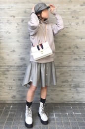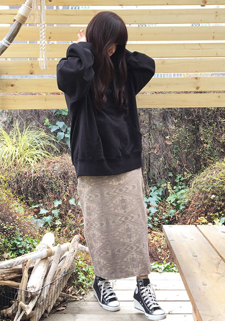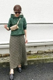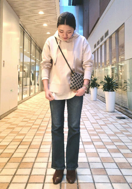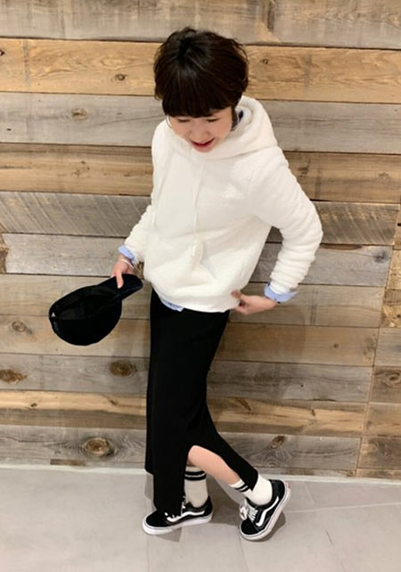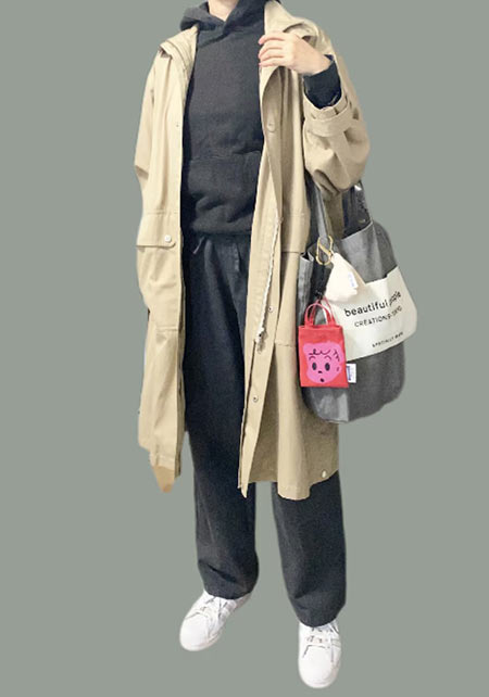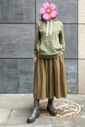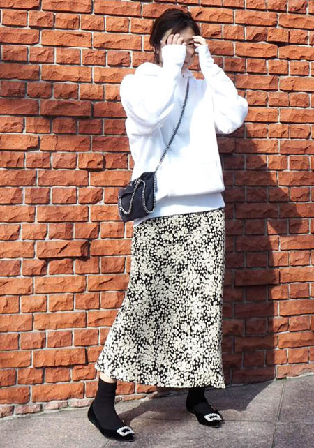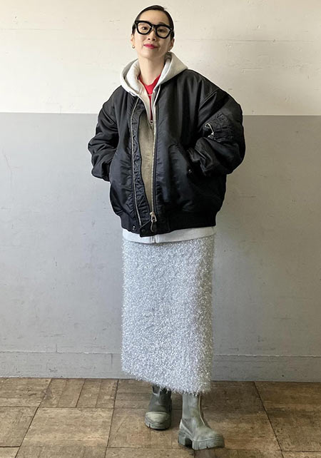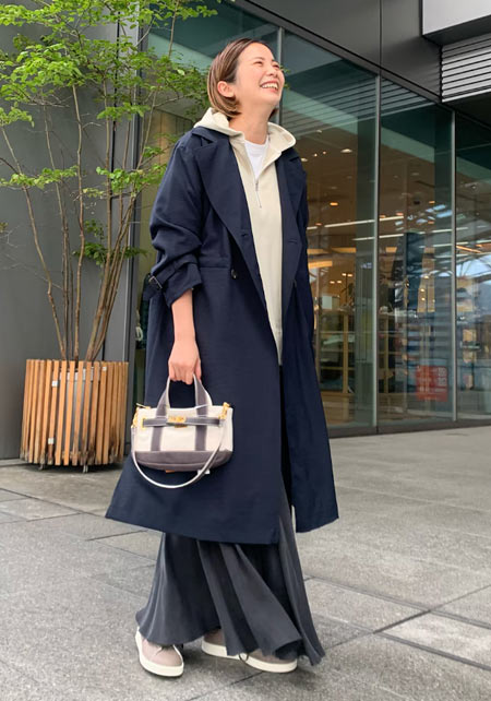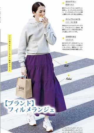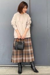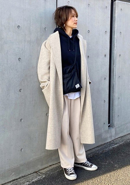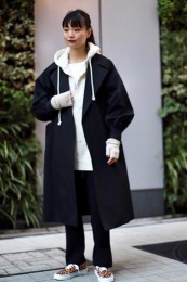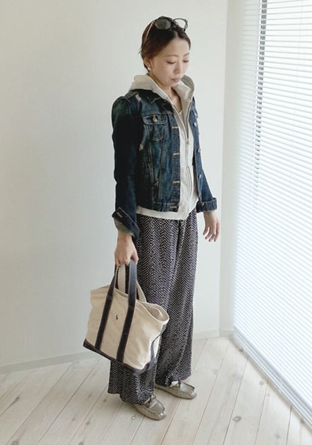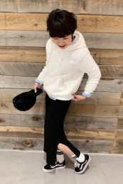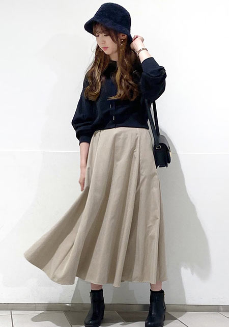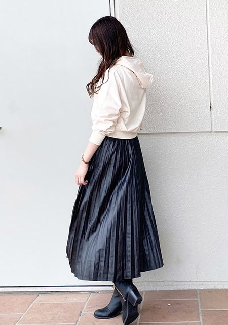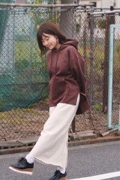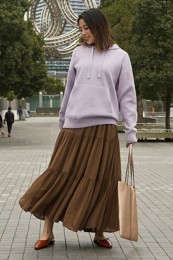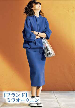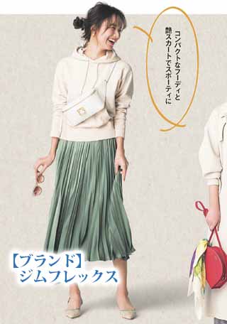 顔まわりのボリューム感が足され、目線が上がるフーディ。ロングスカート&ぺたんこ靴のときにバランスよく見せてくれるお役立ちアイテムです。