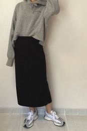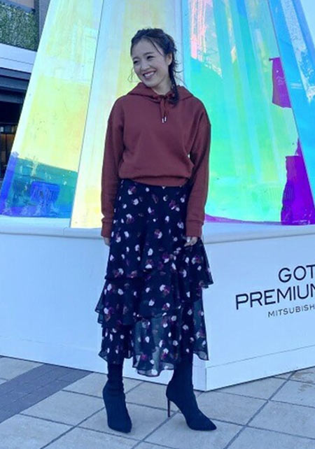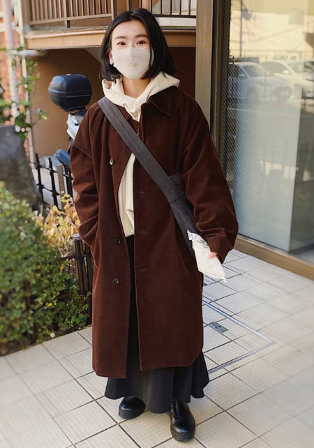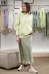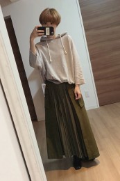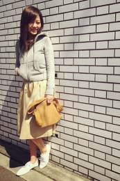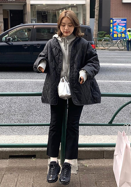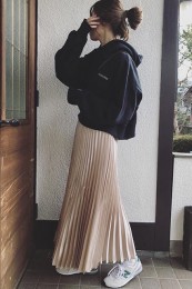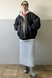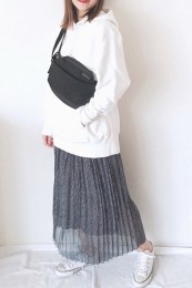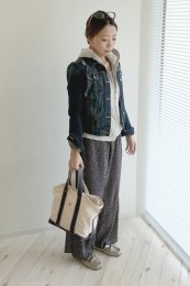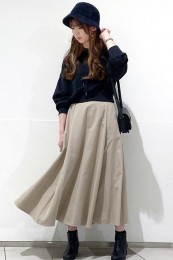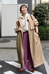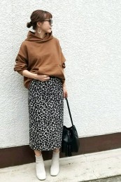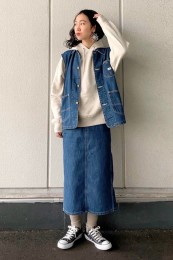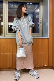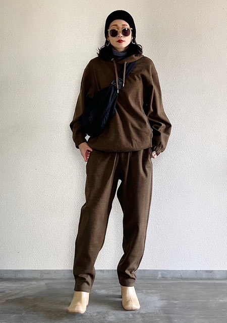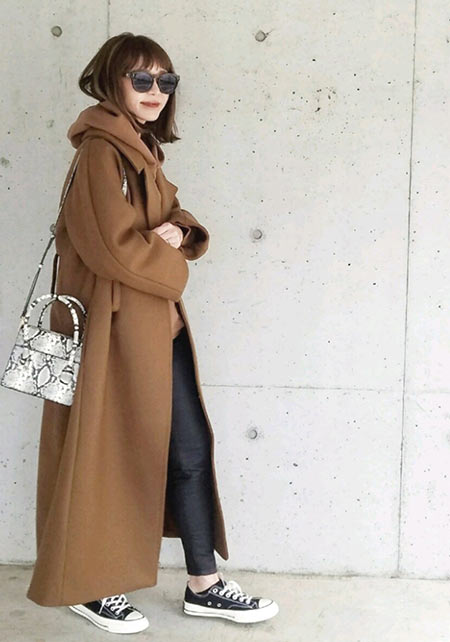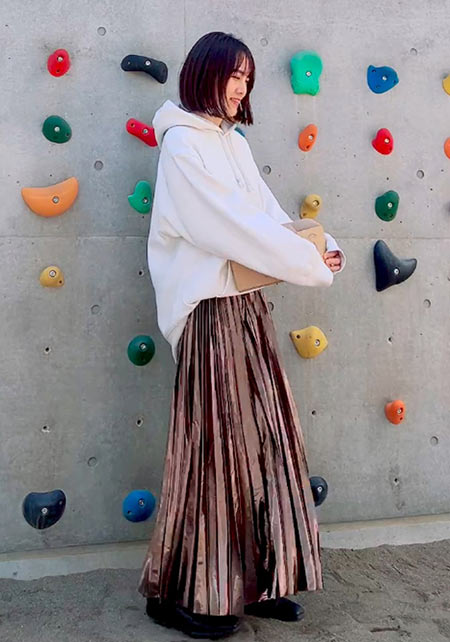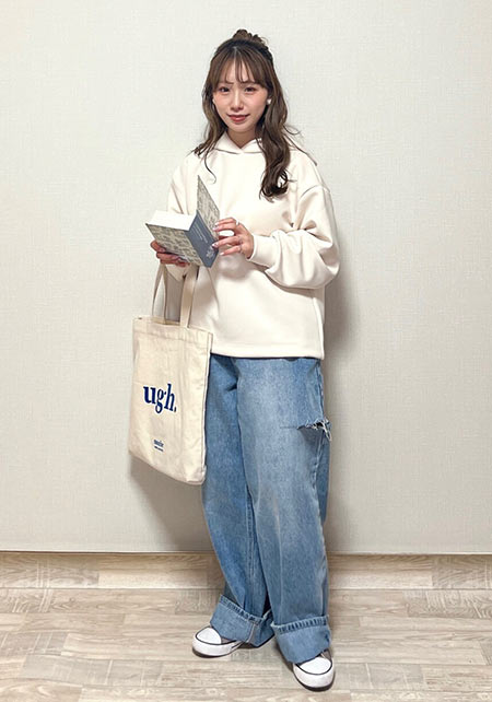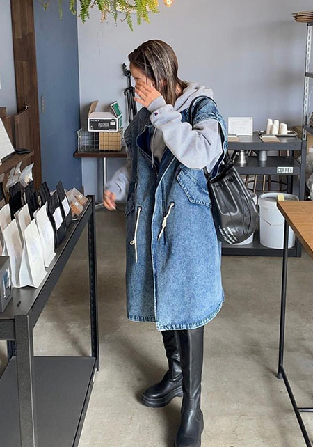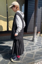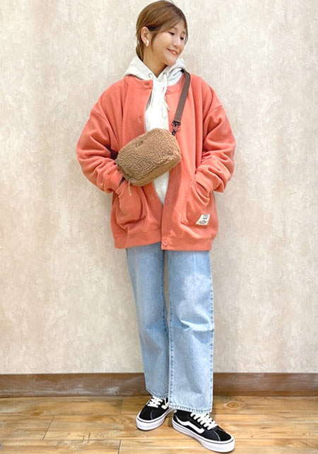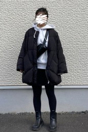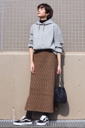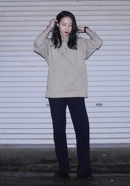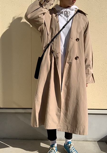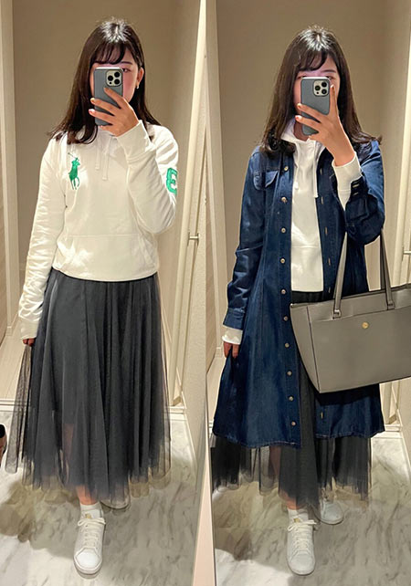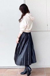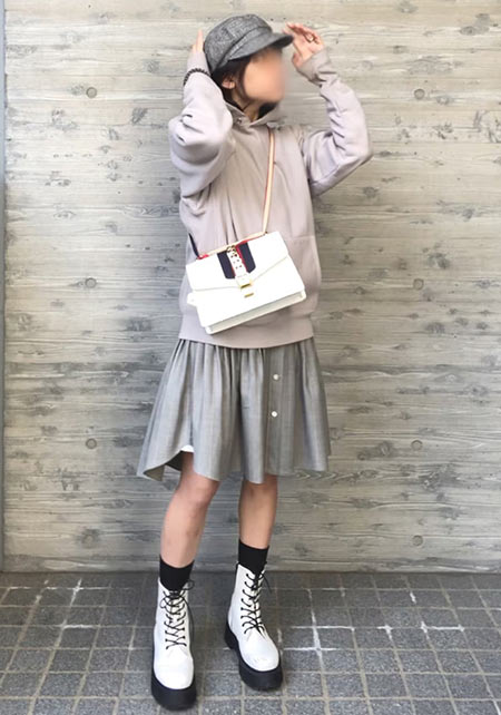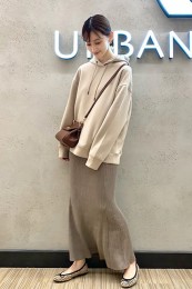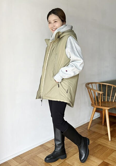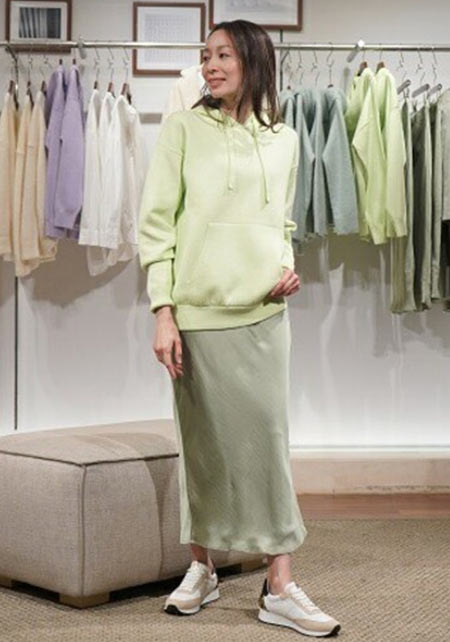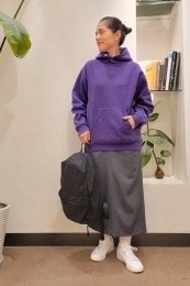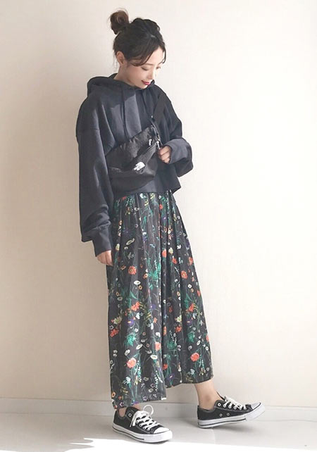 顔まわりのボリューム感が足され、目線が上がるフーディ。ロングスカート&ぺたんこ靴のときにバランスよく見せてくれるお役立ちアイテムです。