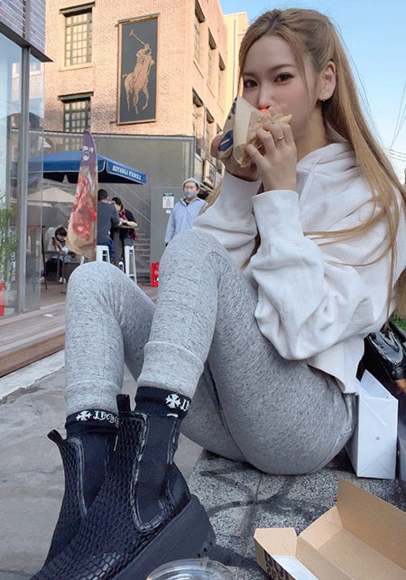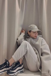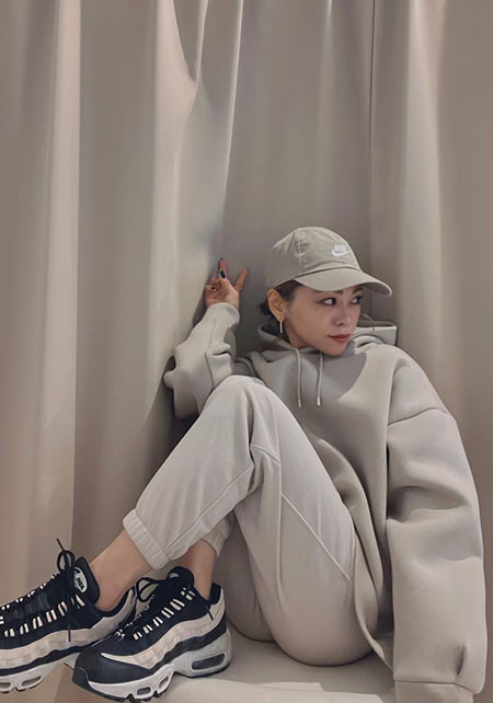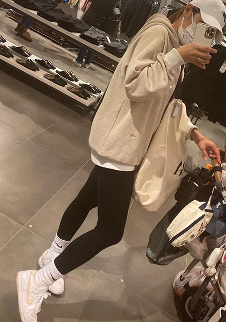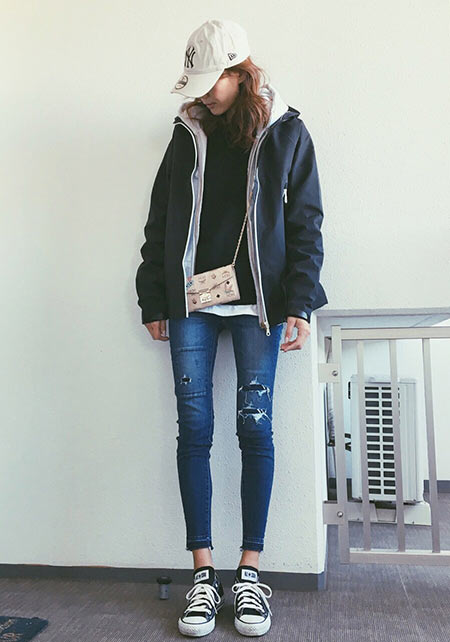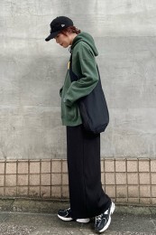 首周りにボリュームのあるフーディはキャップとも好バランス。ちなみにキャップをかぶるとき、髪はニュアンスを出してゆるっとまとめると“女っぽさ”がアップします!