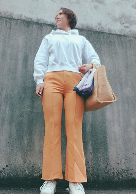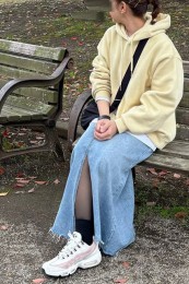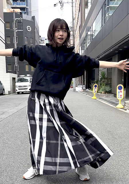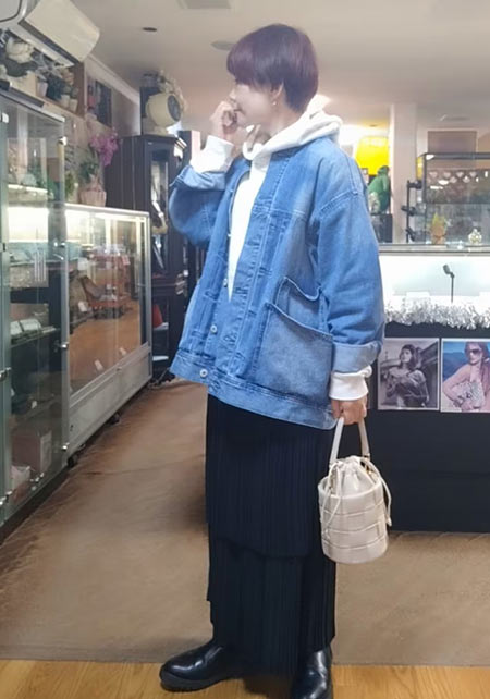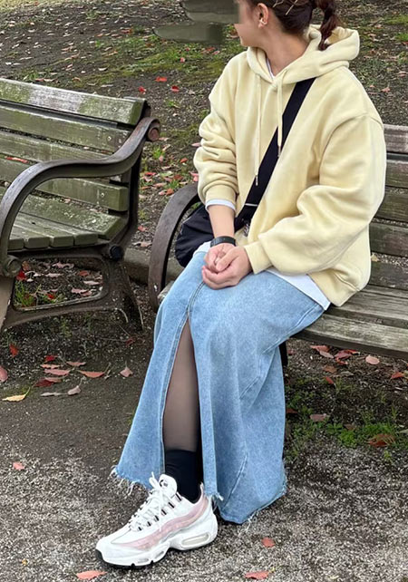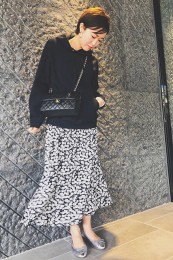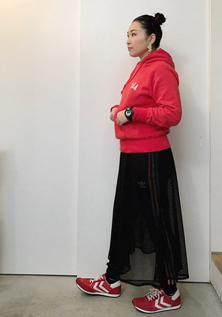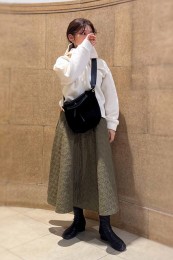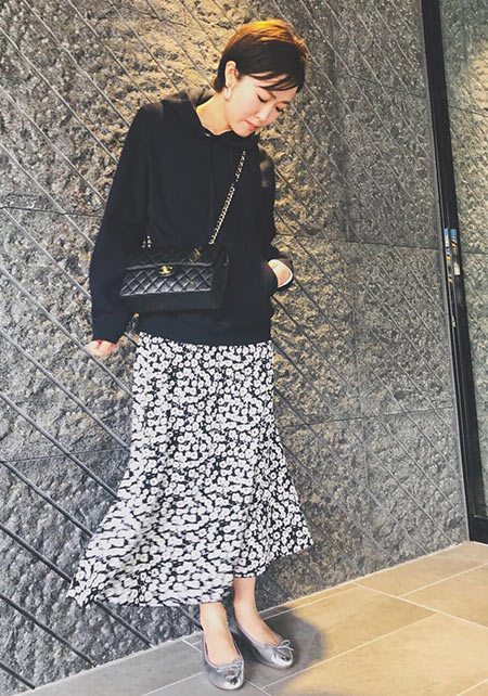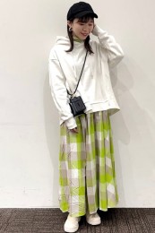 1番の近道はスカートを合わせること。女性らしさが加わり“ご近所コーデ”になるのを防げます。