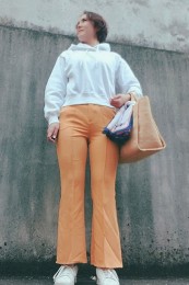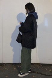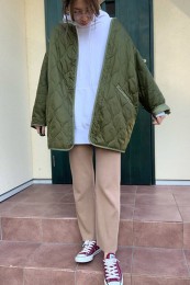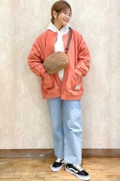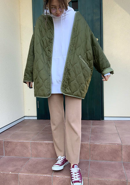 目の細かいコットン100%で、カジュアルな中にも上品さのある素材感がポイント。シルエットはバランスのとりやすい細身のコンパクト。くすみ系のカラーが、どこか大人っぽい。