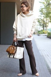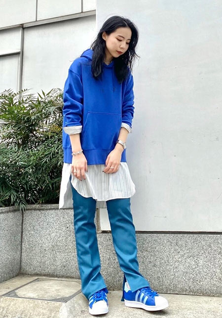 きちんとした雰囲気をシャツが醸し出し、カジュアルなフーディを格上げ。生真面目になりすぎないように、裾や袖口からもシャツを出して着崩すと大人っぽくこなれた印象になります。白同士を重ねればなじみがよく失敗にしくいです。