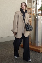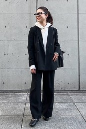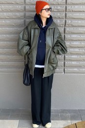 またパンツ系ならキレイめパンツ、流行のレギンスが好相性です。やりがちなブルーデニムは“おばさん”っぽくなりやすいので、デニムならスタイリッシュ見えするブラックがおすすめです。