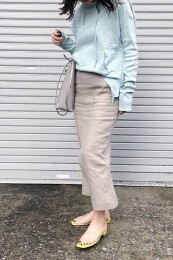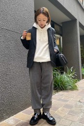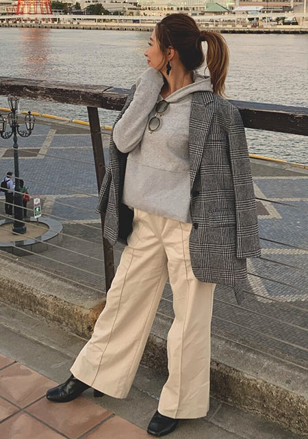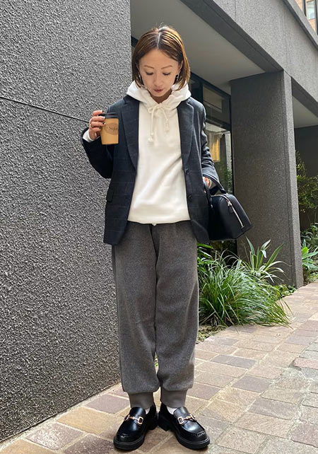 グレー系などの普段着ているベーシックなパーカーも着こなし方 次第できれいめに格上げすることができます。