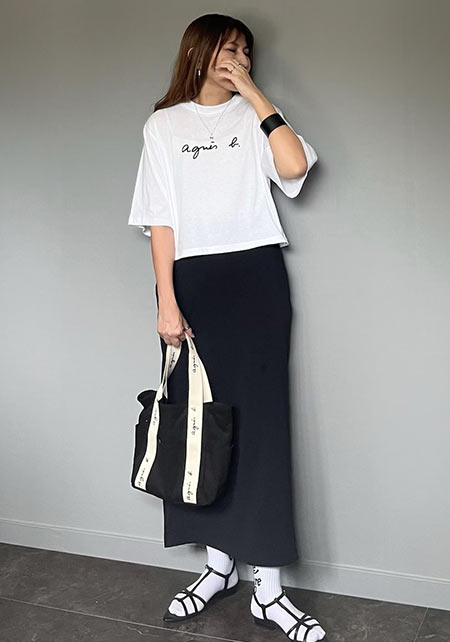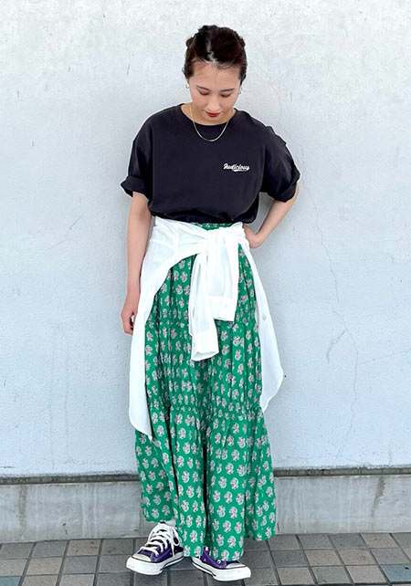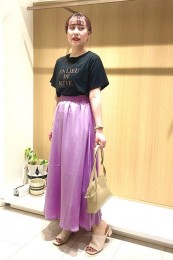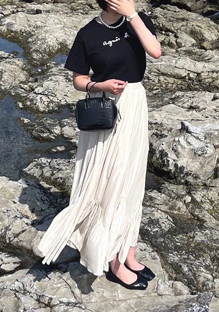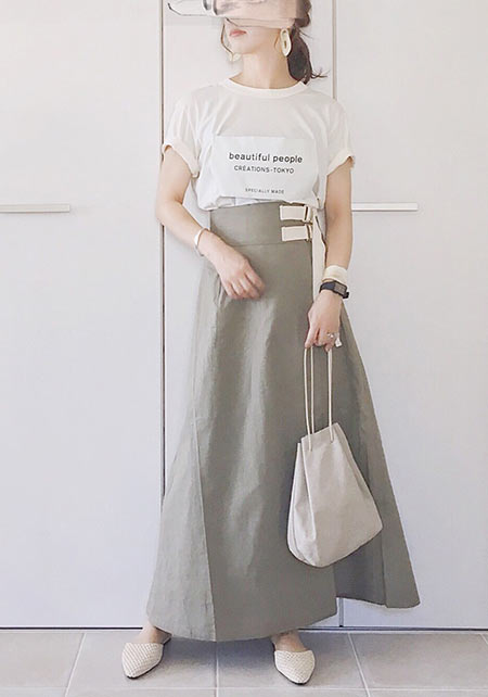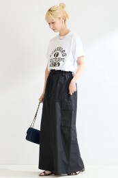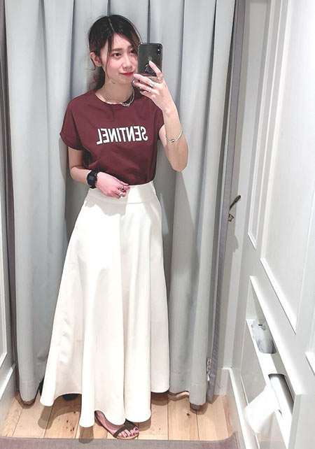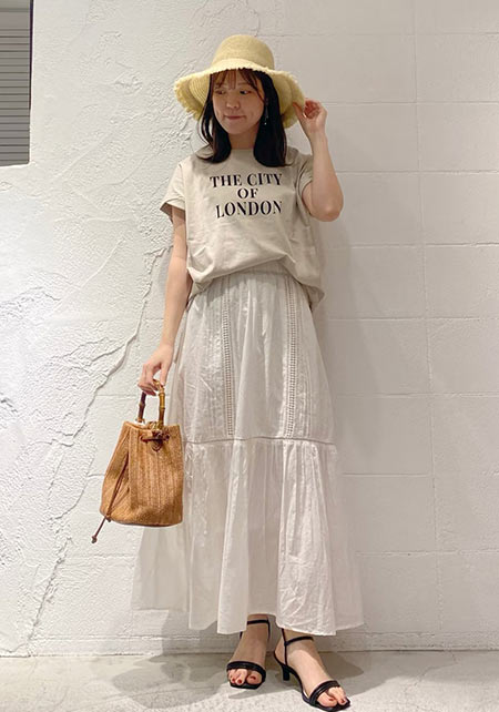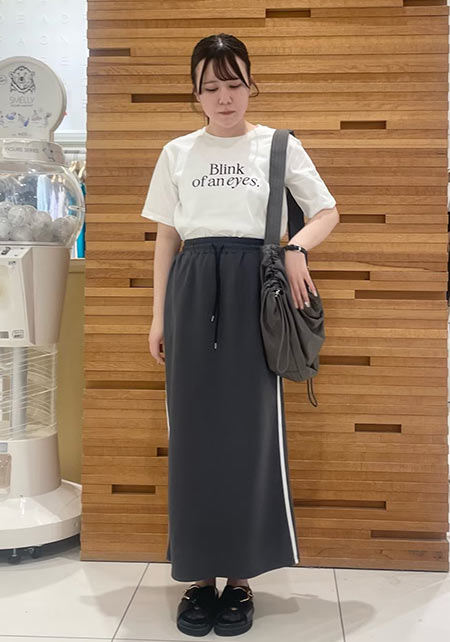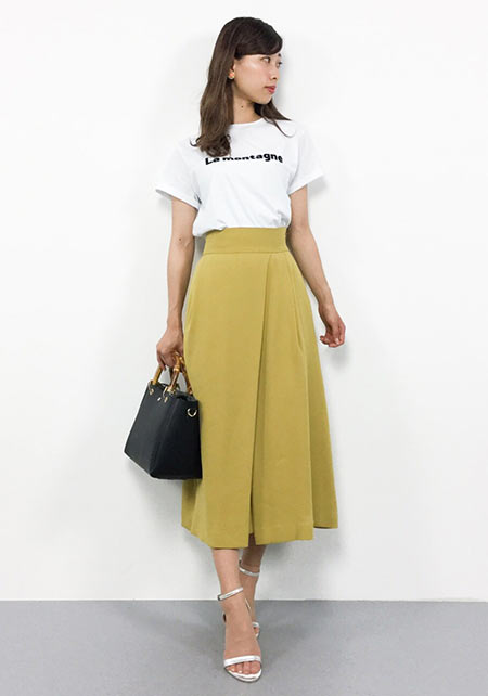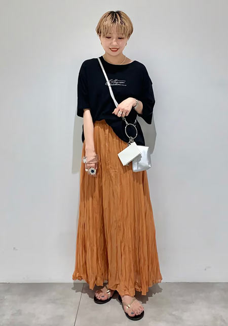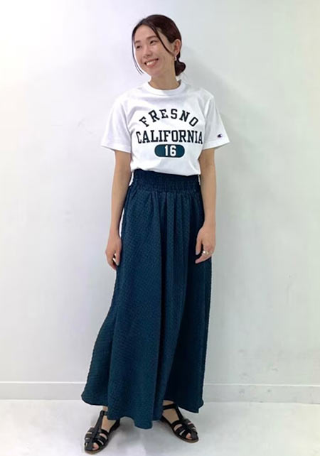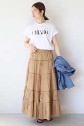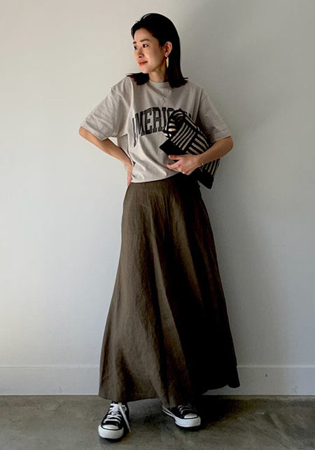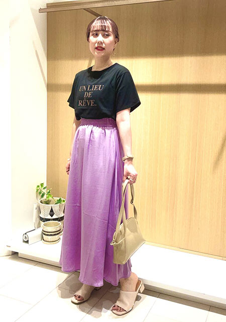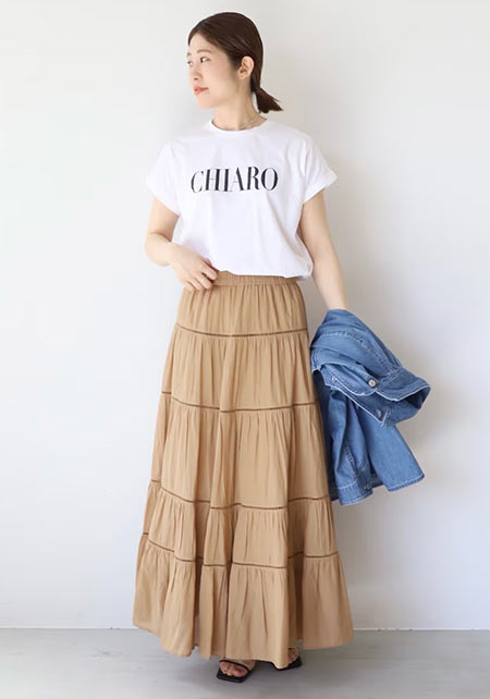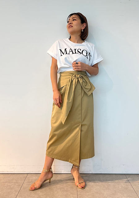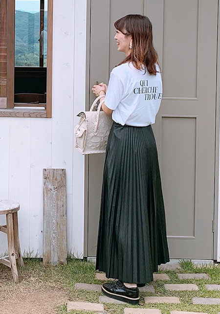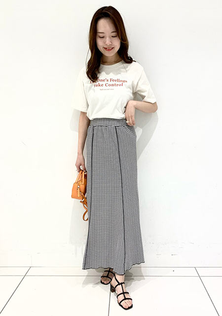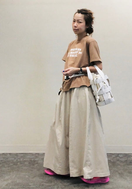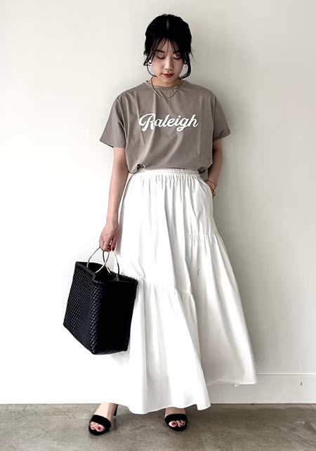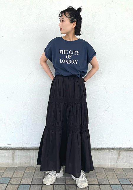 カジュアル要素の強いロゴTには、あえて逆のスカートで女らしさを引き寄せるのが◎