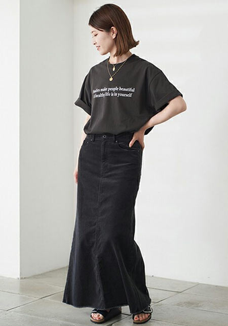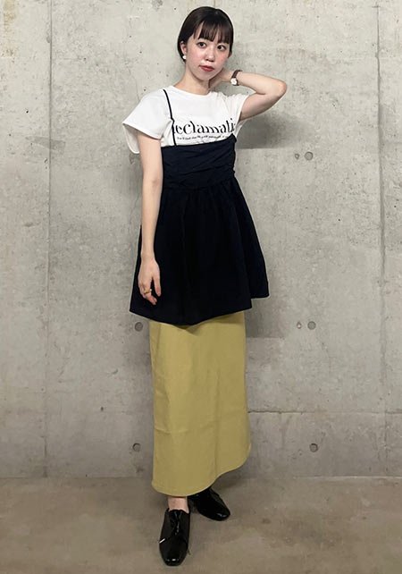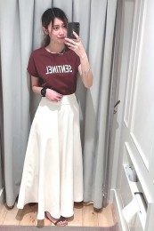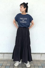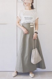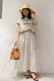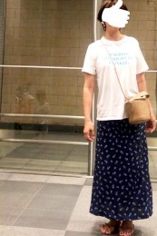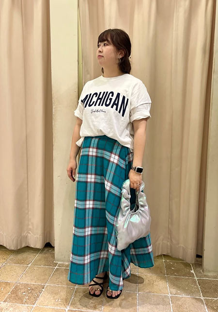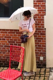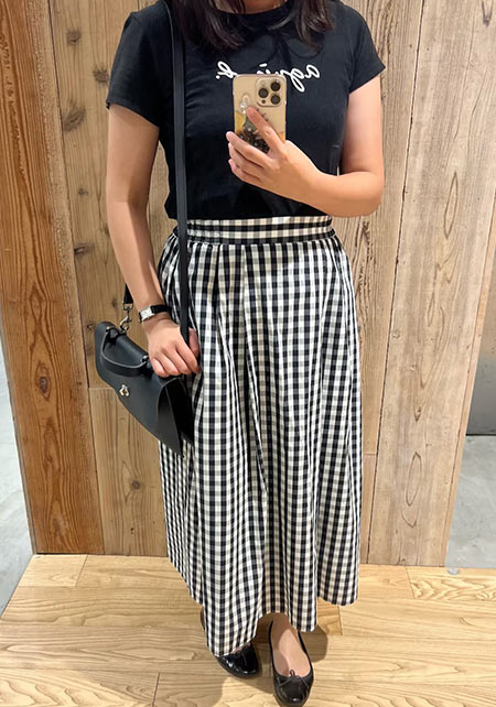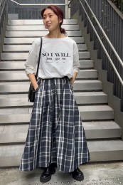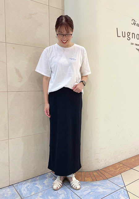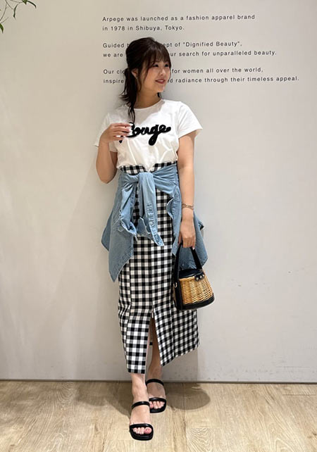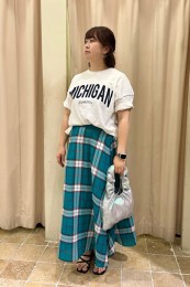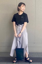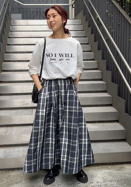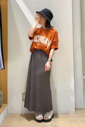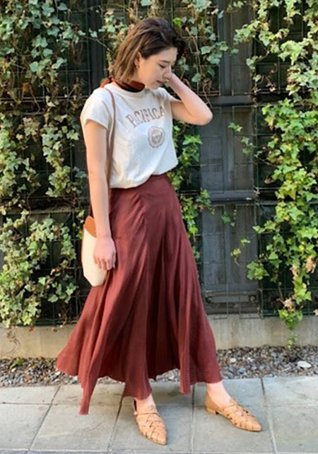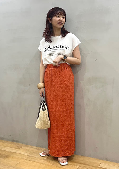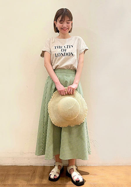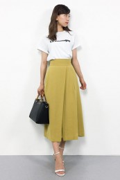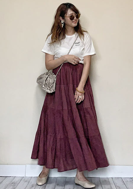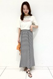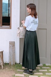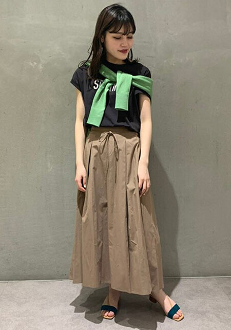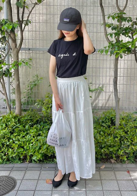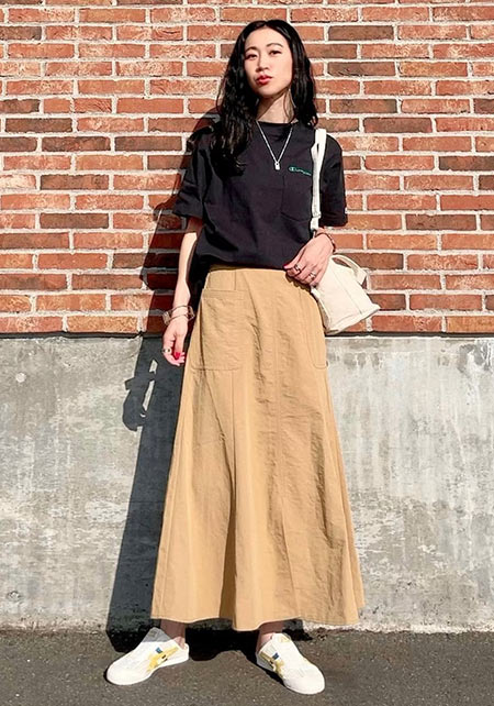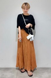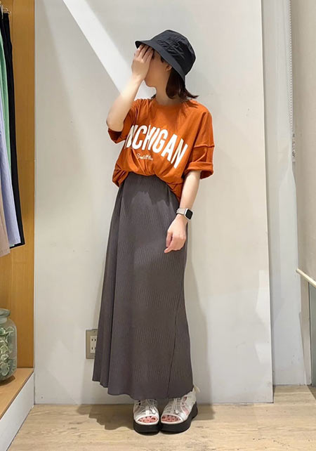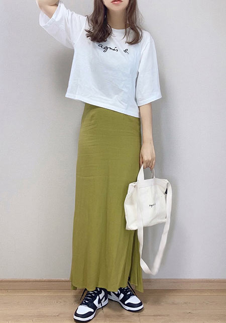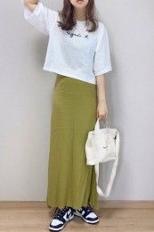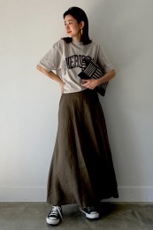 カジュアル要素の強いロゴTには、あえて逆のスカートで女らしさを引き寄せるのが◎