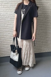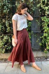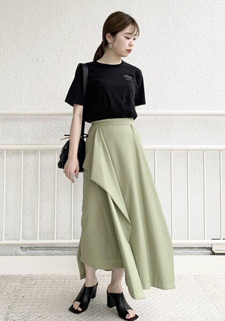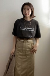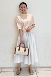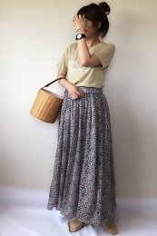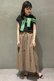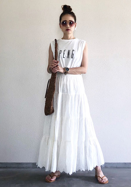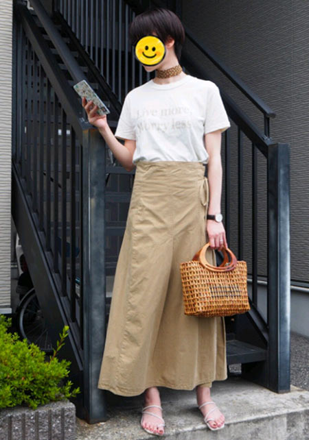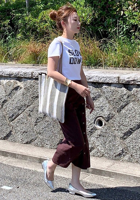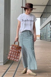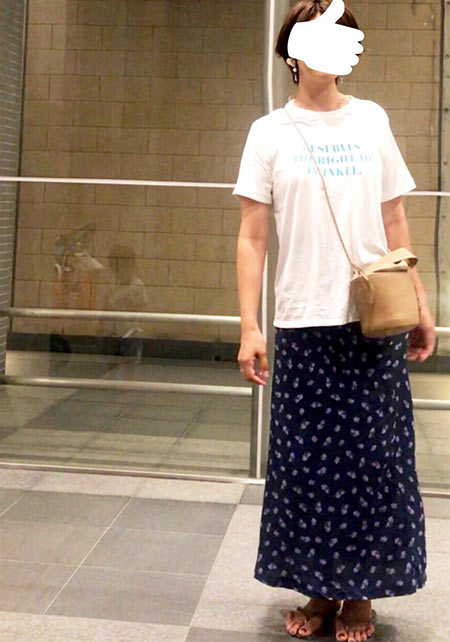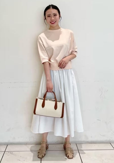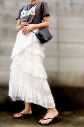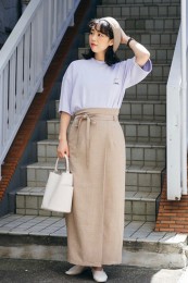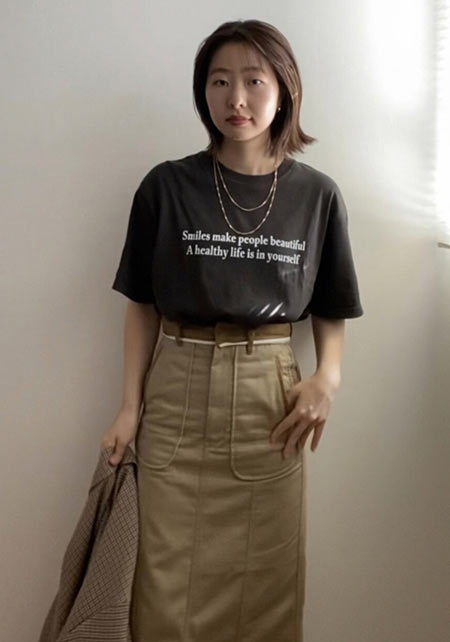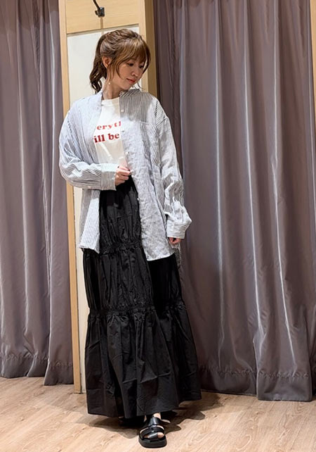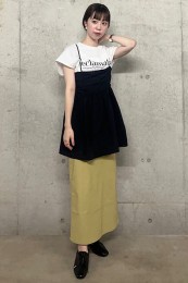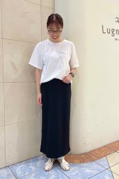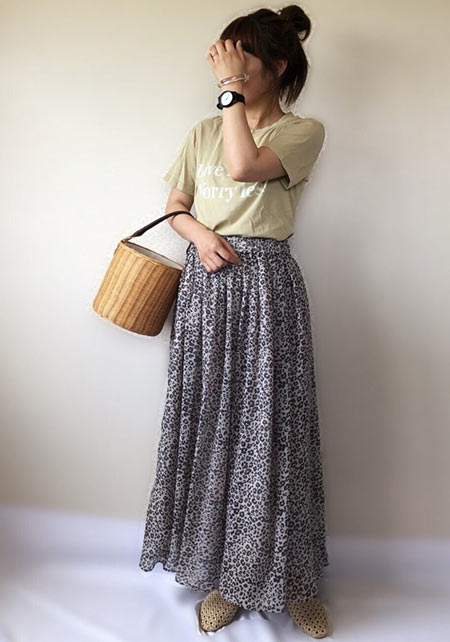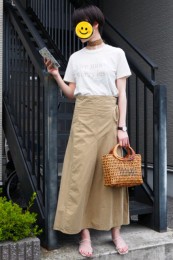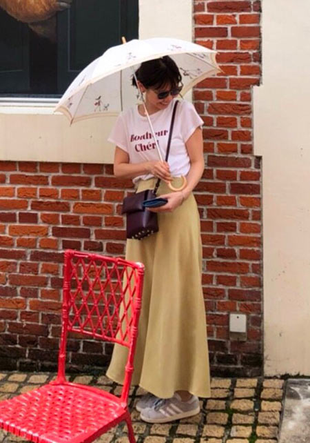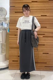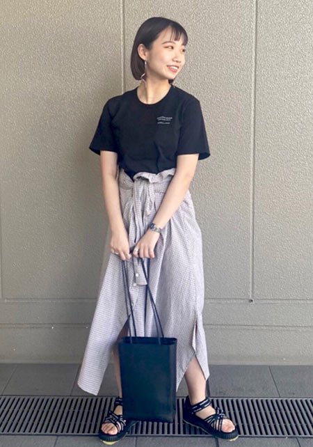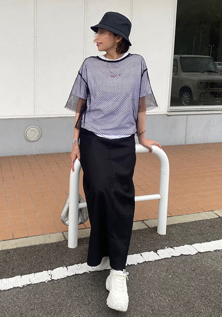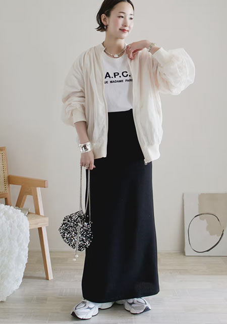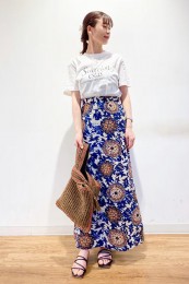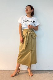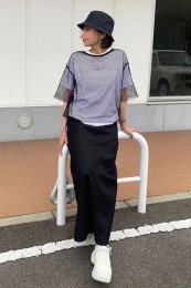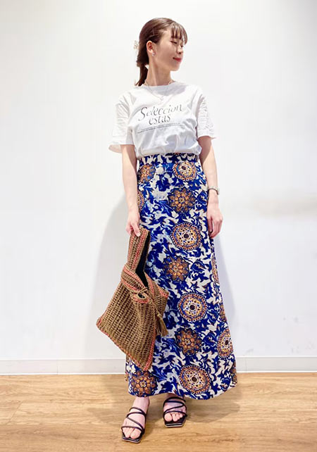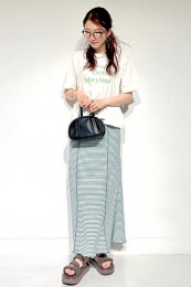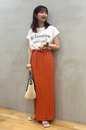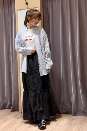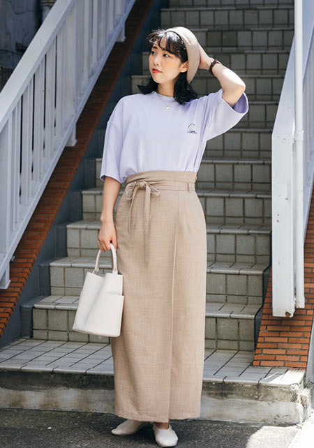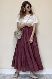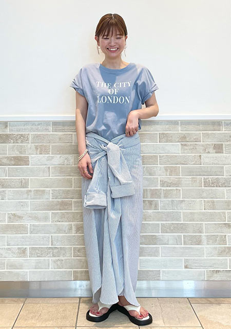 カジュアル要素の強いロゴTには、あえて逆のスカートで女らしさを引き寄せるのが◎