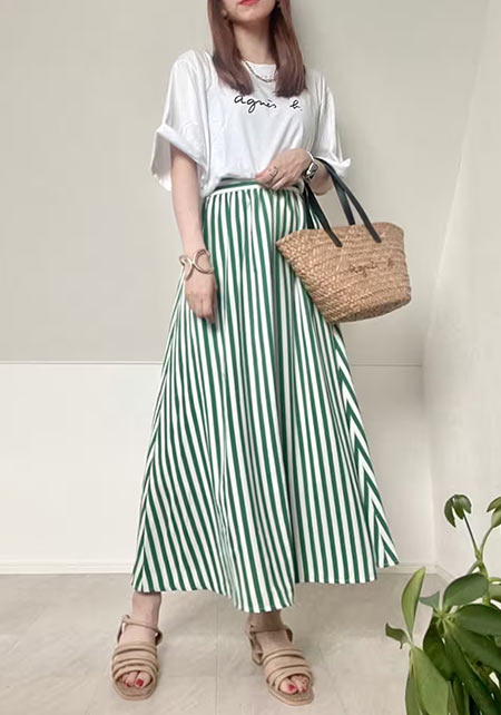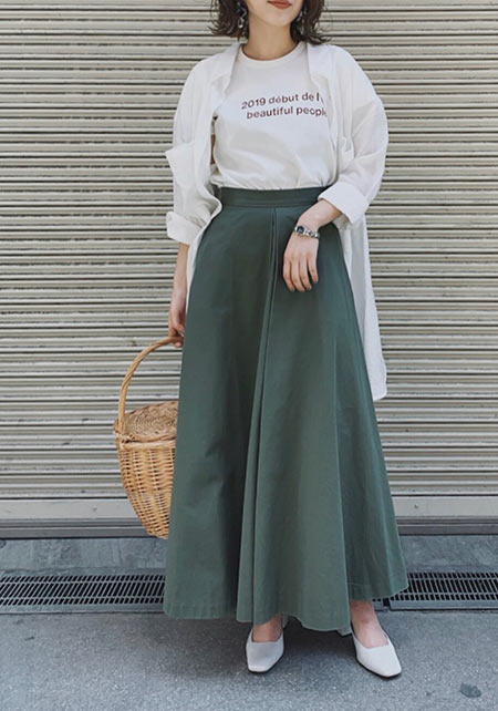 万能ならフレア、フェミニンならレース、レディカジュアルならチノやデニム地、などなど種類は好みに合わせて。