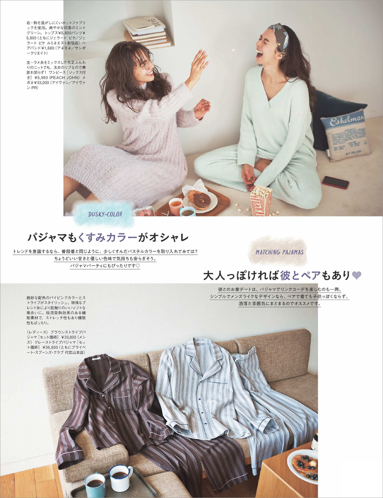 〈写真右〉このポップな派手柄パジャマはP.J.Salvageです。夏は主人がクーラー派なので寒がりの私は冷え予防に長袖が必須。パジャマを選ぶときは、肌触りとデザインを重視。
