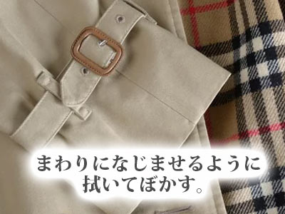 首周り、袖口、裾など、すれやすい箇所は、乾いた布にベンジンを含ませて汚れを落とします。