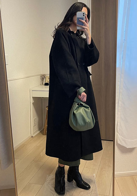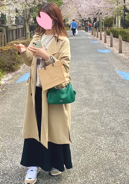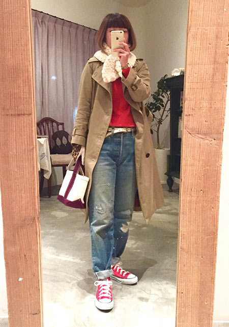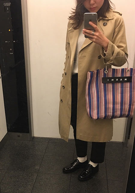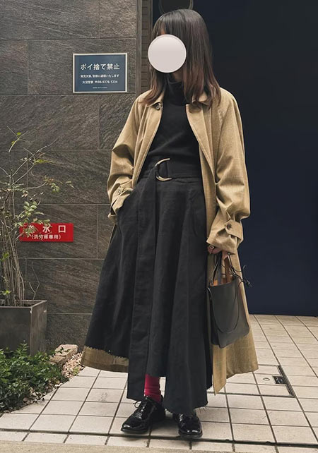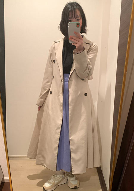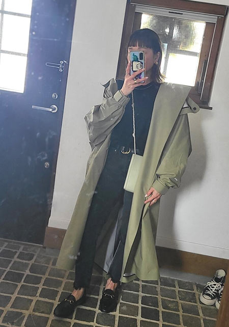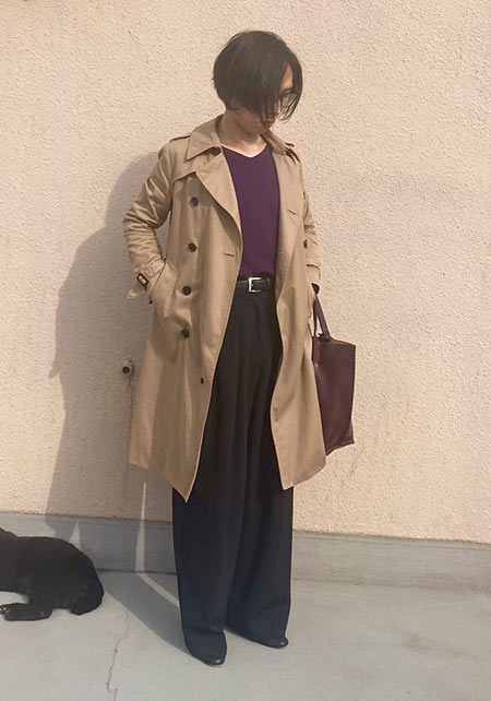 ノークのトレンチはオーバーサイズのシルエットと長めの丈が気に入って購入。きっちり着るよりもラフに着るほうが女らしい気がして1サイズ上げました。女友達とランチの日はニットワンピでとびきり女らしく見えるようなコーデを楽しみます。