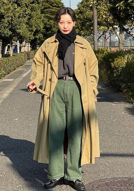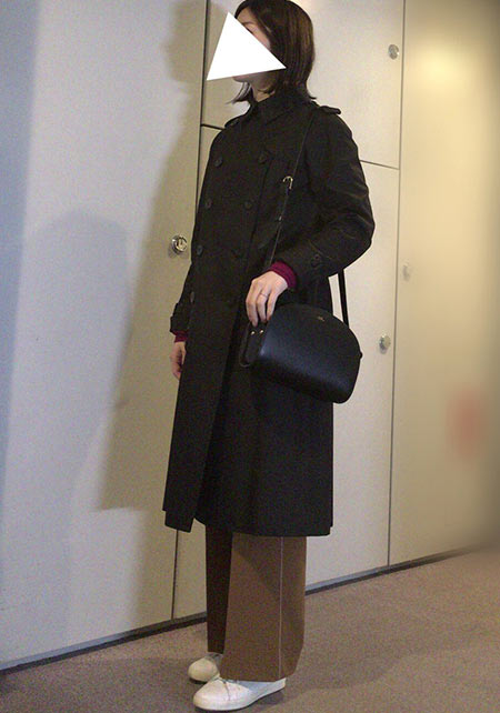 〈右コーデ〉トレンチコートのハリのある素材ときちんと感はストレートパンツも似合う。