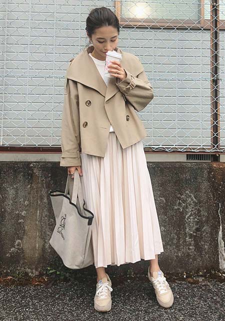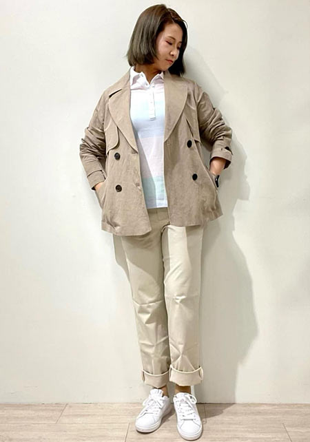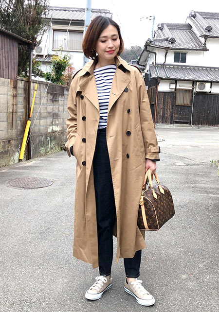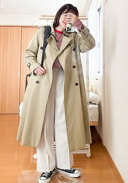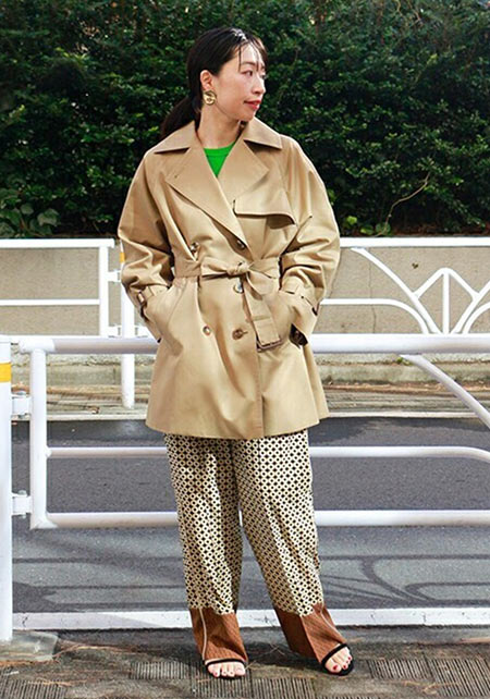 〈コーデ〉自転車送り迎えや親子遠足、芋掘りなどアクティブ園行事もショートトレンチならもたつきもごわつきもなし。バランスを気にせずスッキリ着こなせる、毎日服の味方に!