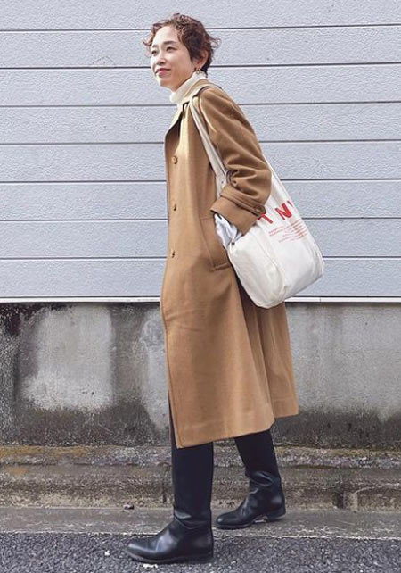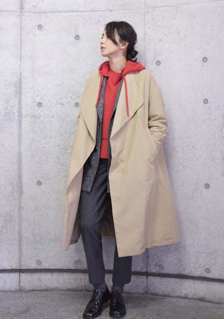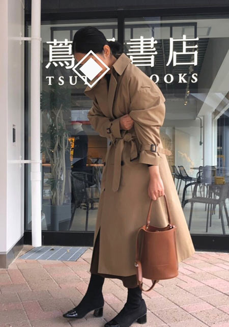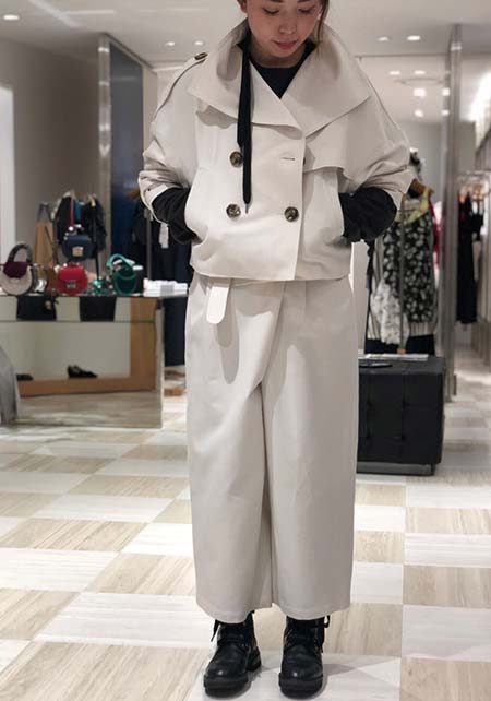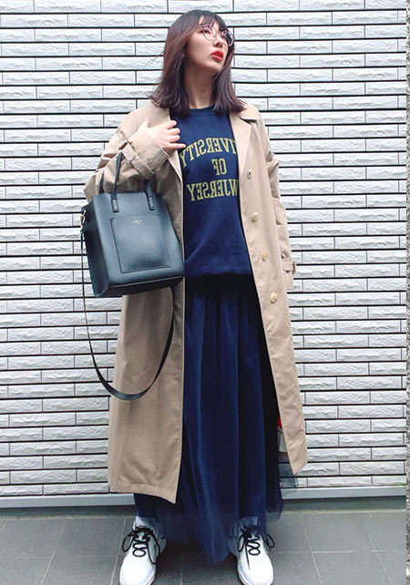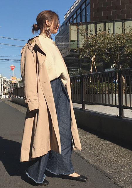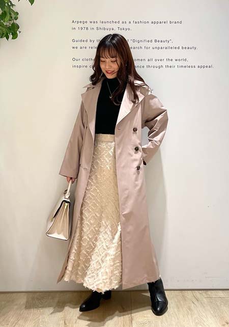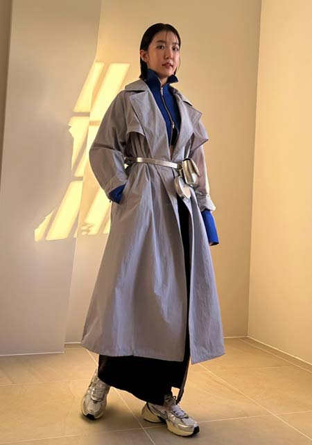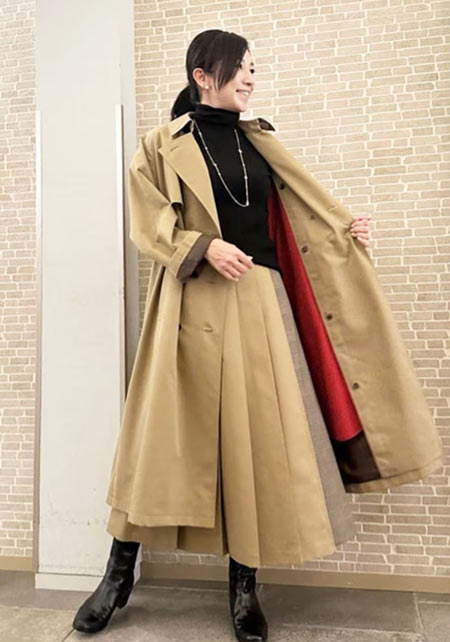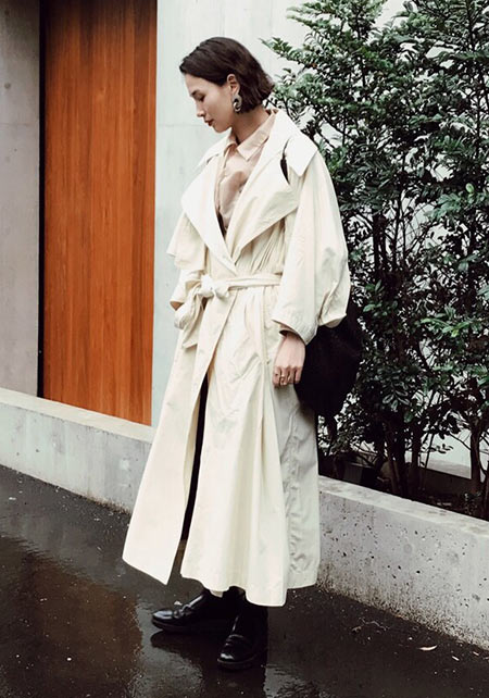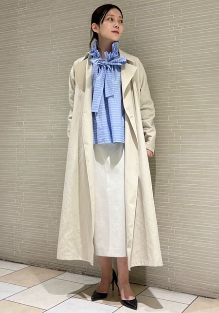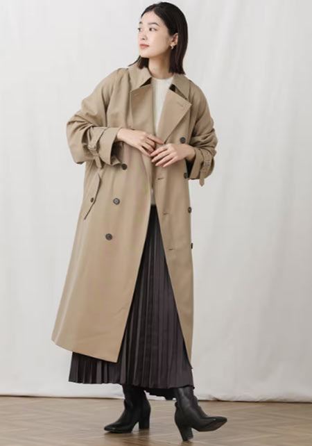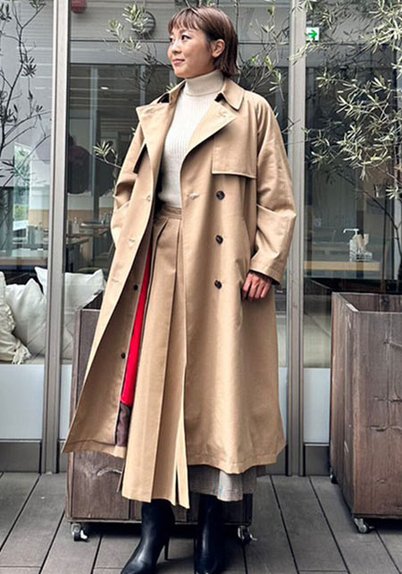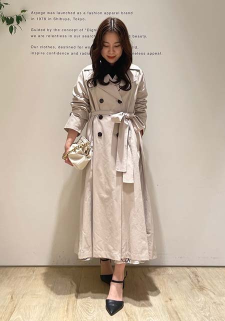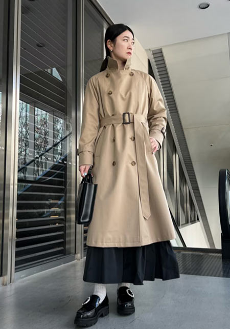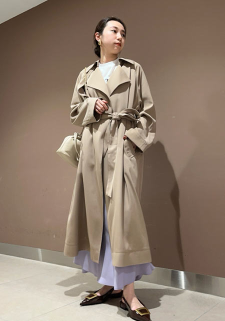 ウエストをベルトで締めると、まるでドレスのような着こなしになるトレンチコート。生地をたっぷり使い、ボリューム感たっぷりに広がるシルエットはシンプルなニットやふんわりしたプリーツスカートとうまく馴染み、女性らしい雰囲気を醸し出します。