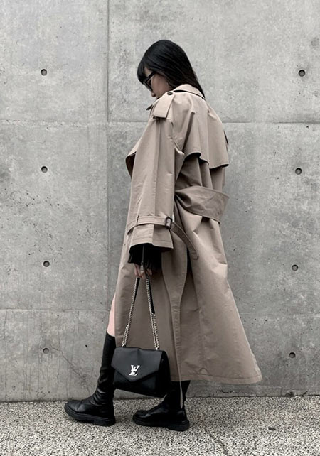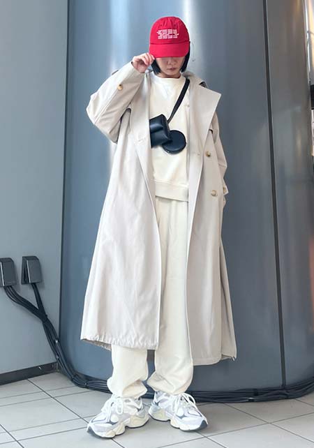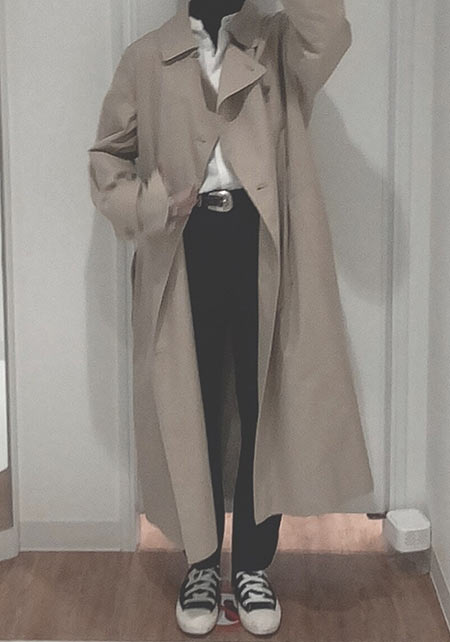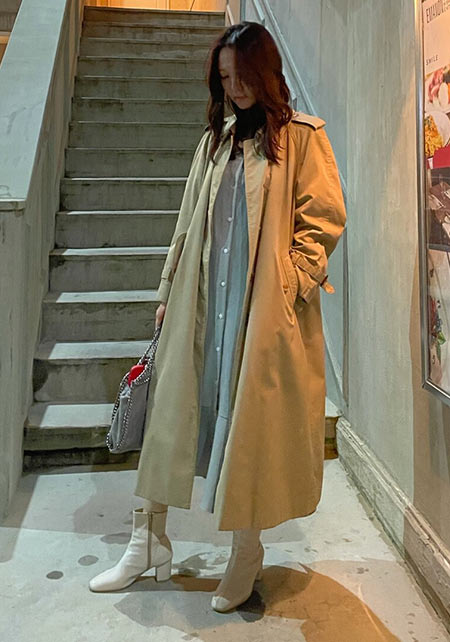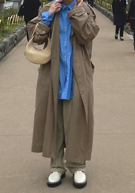 落ち感のある素材と、ダボッと羽織れる大きめのサイジングが今年っぽい。流行に関わらず飽きずに着られるベージュのトレンチは一枚持っておくと心強いです。