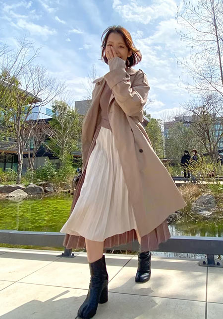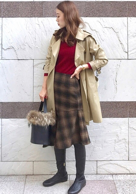 〈下右コーデ〉どんなコーデも一気にサマになる、トレンチのこなれた着方といえばコレ!ベストをキュッと締めることでコートの身ごろにふんわり立体感を出し、細いウエストをアピール。スカートのすそがちらりと見える丈に調整すれば、後ろ姿も一段とおしゃれに。