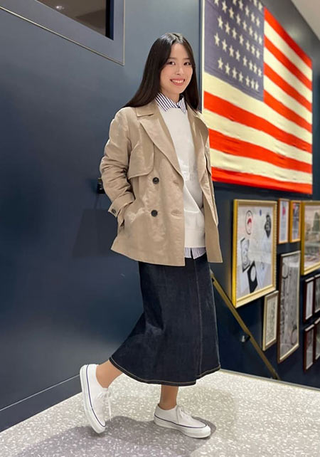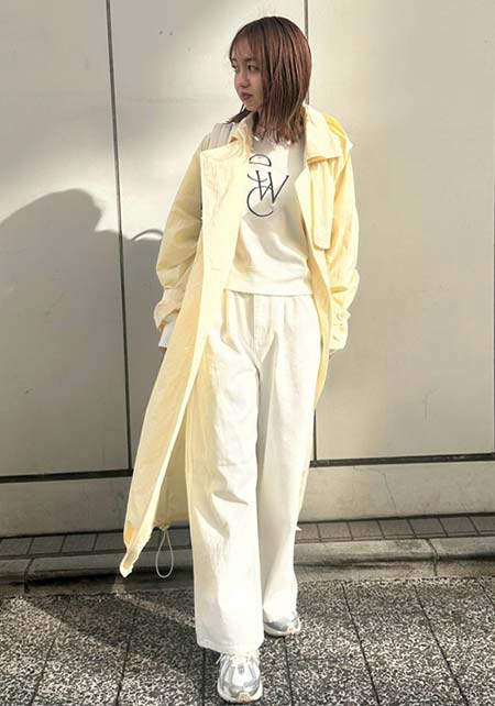 〈右コーデ〉誰でも楽しめる、トレンチとパーカーのレイヤード。単なる無難におちいりがちな、デニムと合わせるボーイズ系コーデも、ホワイトデニムならぐんと上品で爽やかに。