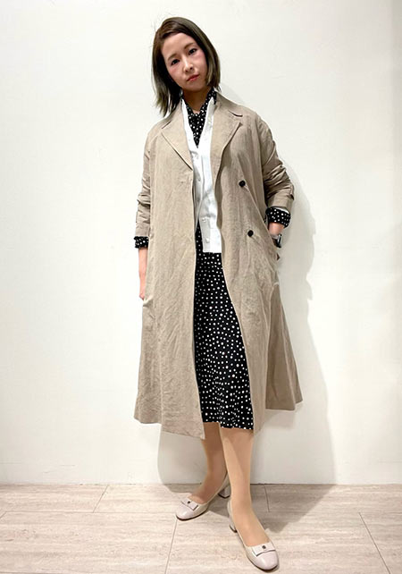 ベーシックさはそのままに、店舗からの要望やトレンド要素を取り入れながら、シーズン毎にブラッシュアップ。今季はシワになりにくい素材を採用し、ボタンのないガウン仕立て。落ち感がキレイでフレアのシルエットも絶妙。