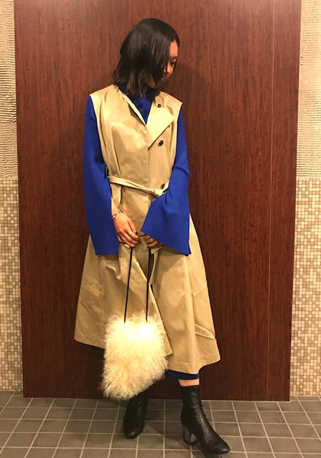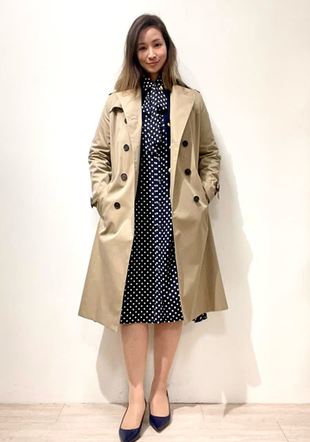 同ブランドで毎年人気のアイテムがこのドレストレンチ。軍服を起源とするトレンチをより女らしく進化させたアイテムで、ワンピースのように着られるのが特徴です。