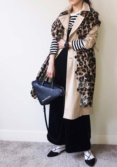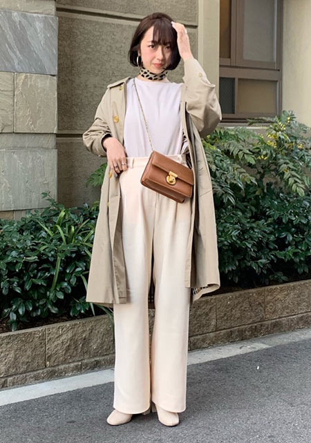 〈コーデ〉シンプルなベージュトレンチのお約束コーデには、レオパード柄でグンとこなれた印象に。